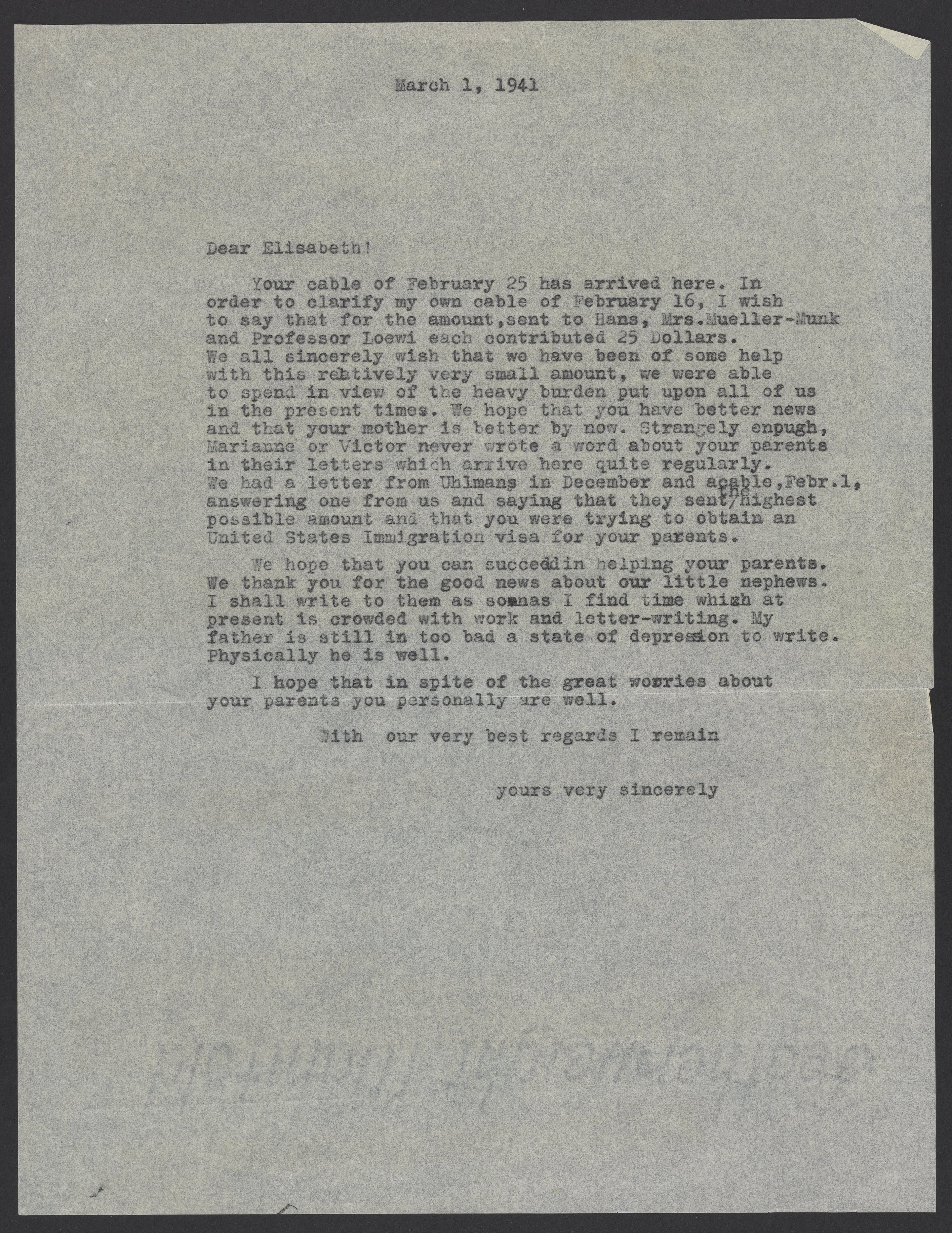 Max Bredig (1902-1977) tells Elizabeth Neumann that he, Otto Loewi (1873-1961), and Mrs. Mueller Munk sent money to Hans Levis.
