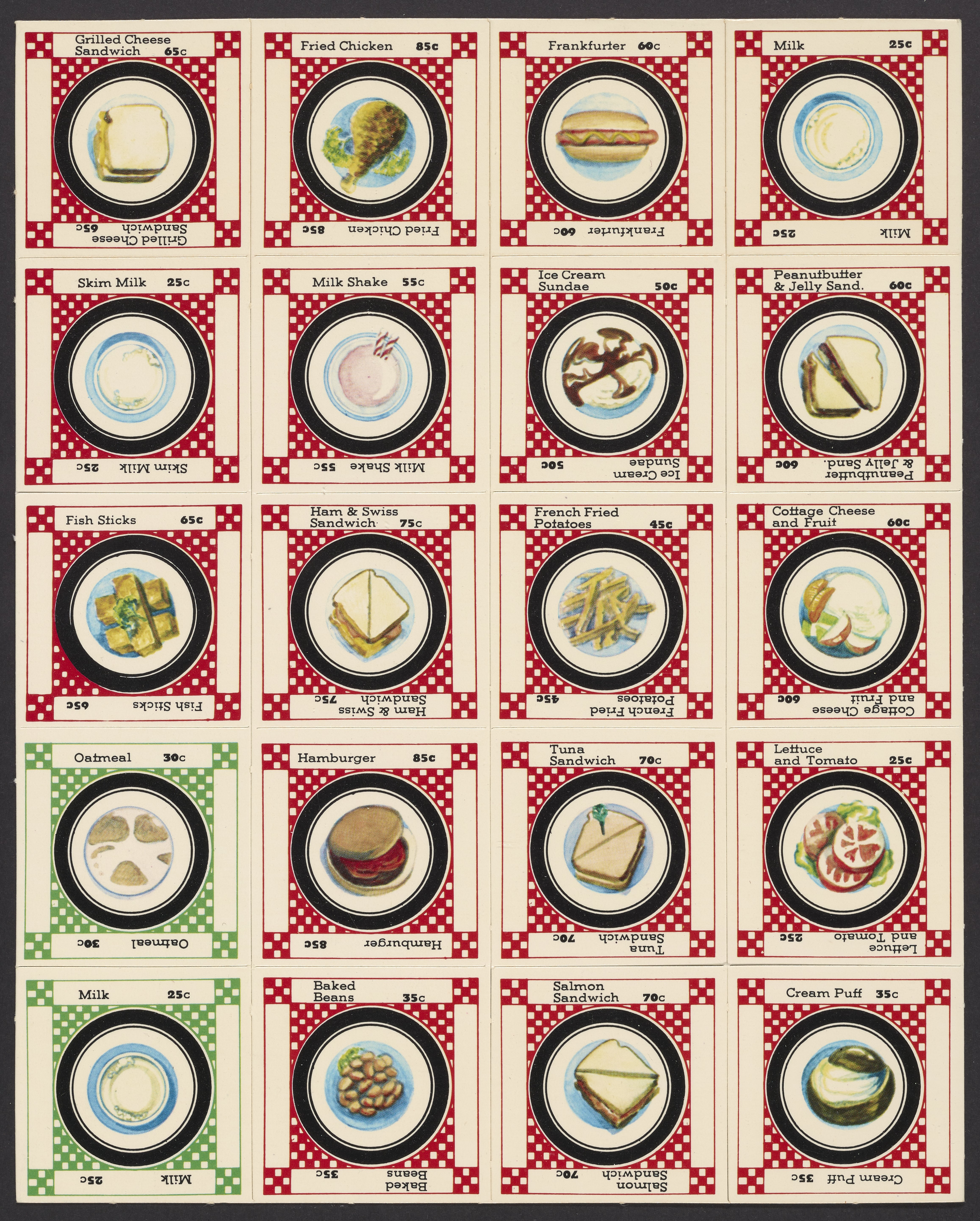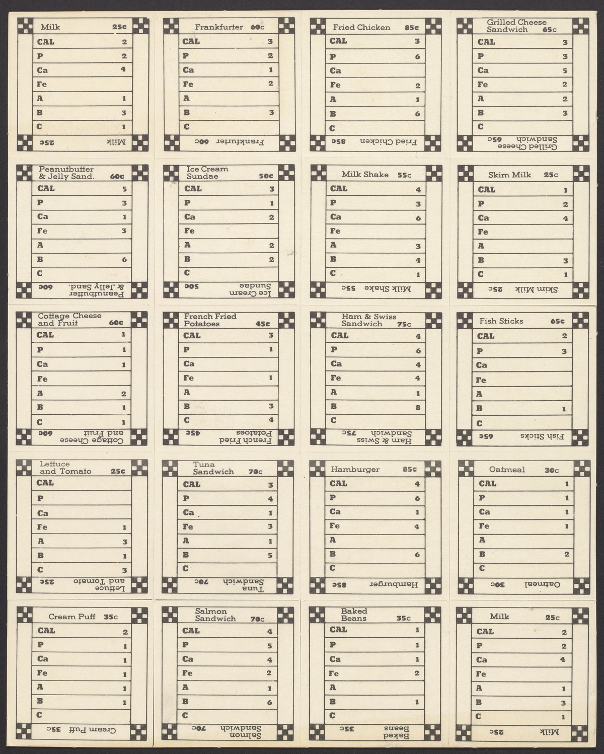 Small JPG1200 x 1200px — 393 KBLarge JPG2880 x 2880px — 1.9 MBFull-sized JPG11189 x 11189px — 31.6 MBOriginal fileTIFF — 11189 x 11189px — 358 MBSuper Sandwich board game, 1973. The object of the game is to create a "super sandwich" comprised of ingredients that will provide the RDA (Recommended Dietary Allowance) of protein, calcium, iron, vitamin A, vitamin B-complex and vitamin C while not exceeding the RDA of calories. Players purchase foods and record the content of each nutrient found in these foods. The first player to accumulate the RDA of each nutrient while remaining within the allowable calorie intake makes a "super sandwich" and wins the game.