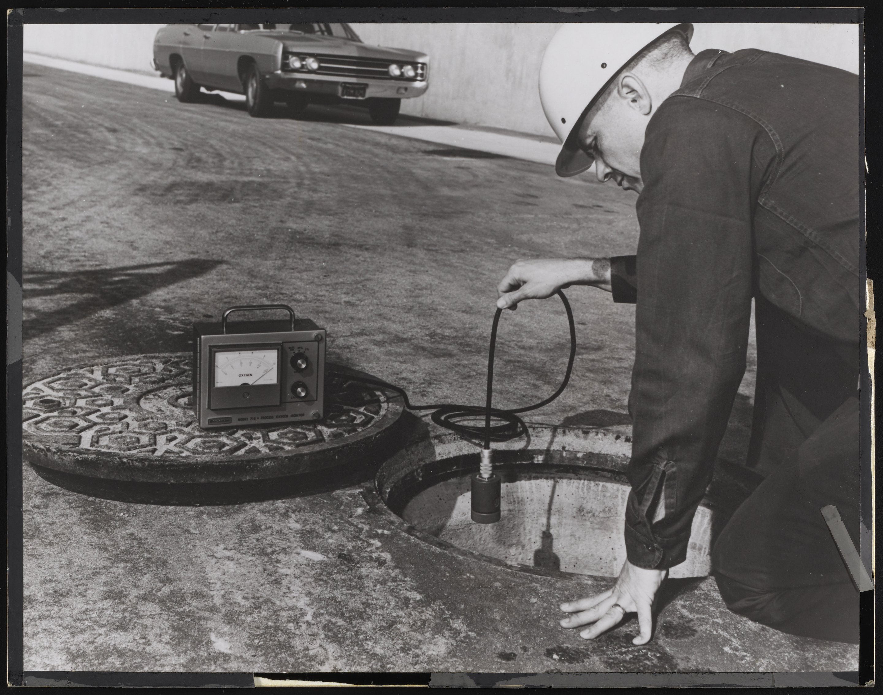 Man kneeling beside an open manhole cover, using a Beckman Model 715 Process Oxygen Monitor