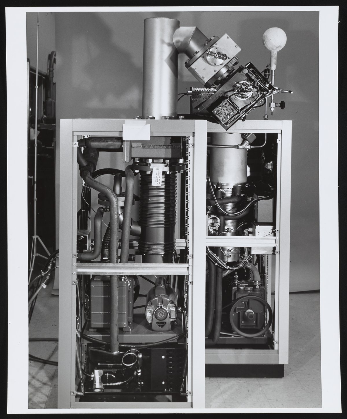 Small JPG1200 x 958px — 165 KBLarge JPG2880 x 2298px — 797 KBFull-sized JPG4316 x 3444px — 1.6 MBOriginal fileTIFF — 4316 x 3444px — 42.6 MBFour general views of the exterior and interior of a Bendix Model MA-015 Differential Pumping System and assorted control panels for various accessories attached to a Bendix Model MA-02 Time-of-Flight Mass Spectrometer system. Components visible in the photographs include an oscilloscope, variable oscillator, ion source, and vacuum system, as well as a control panel for an ionization gauge. The Time-of-Flight Mass Spectrometer (TOFMS) was the flagship analytical instrument of the Bendix Corporation.