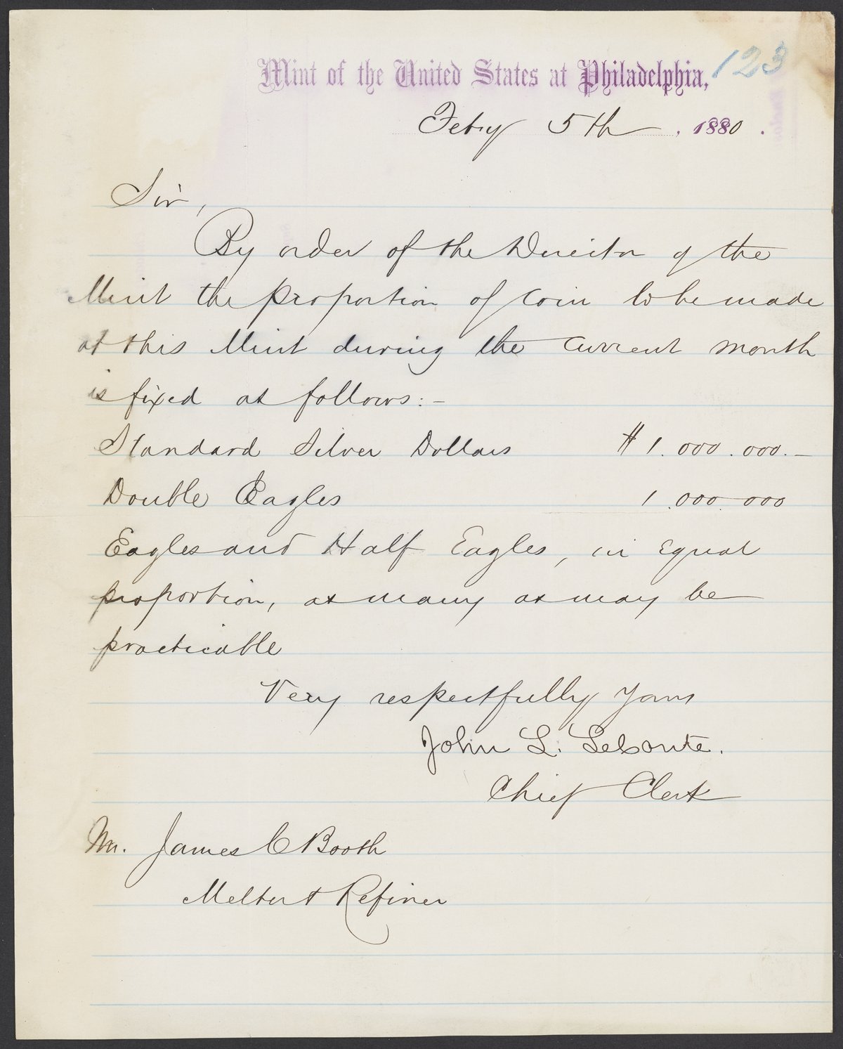 John L. Leboute, Chief Clerk of the United States Mint Superintendent's Office, sets the United States Mint's production rate for February.
