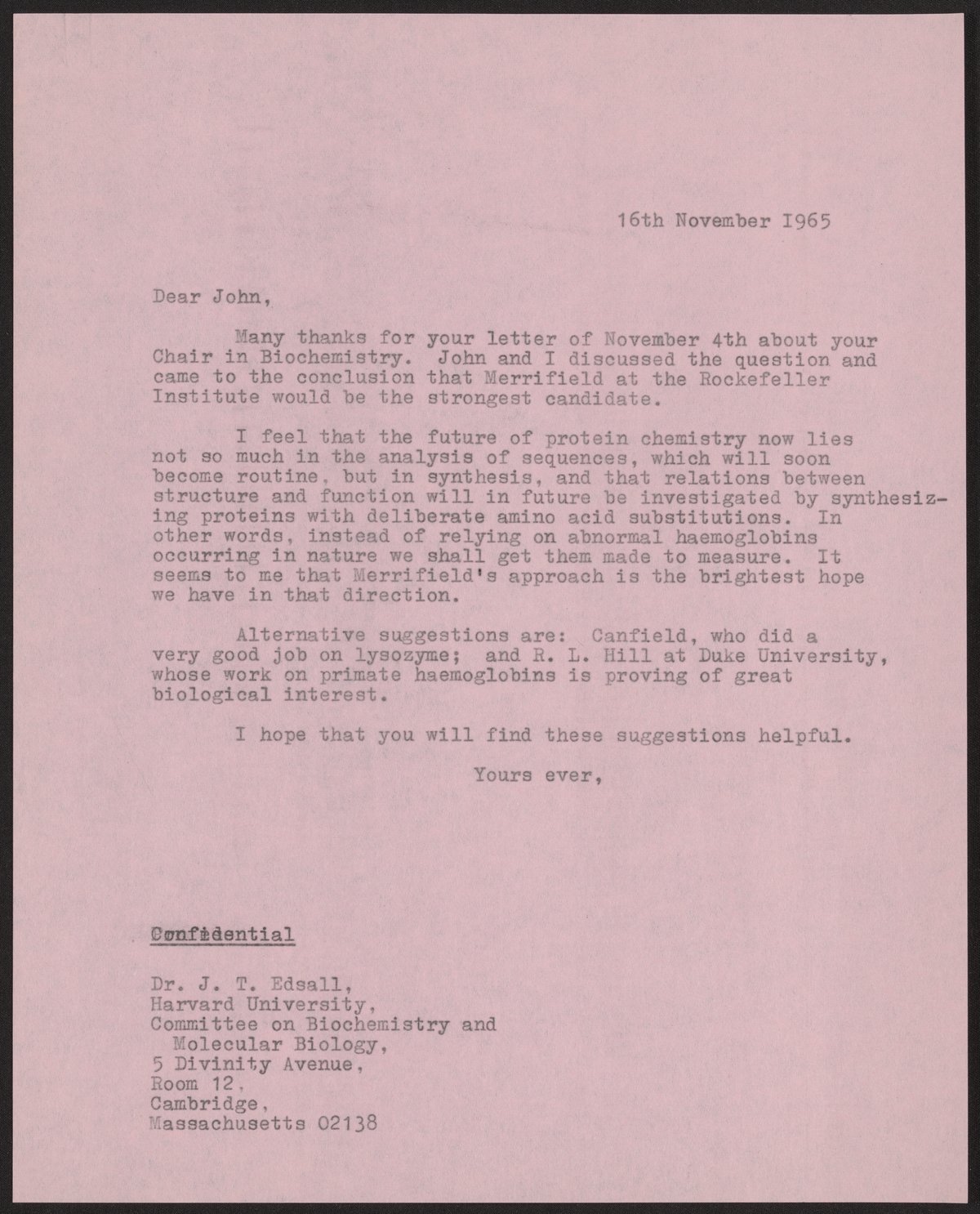 Letter from Max Perutz to John T. Edsall, November 16, 1965