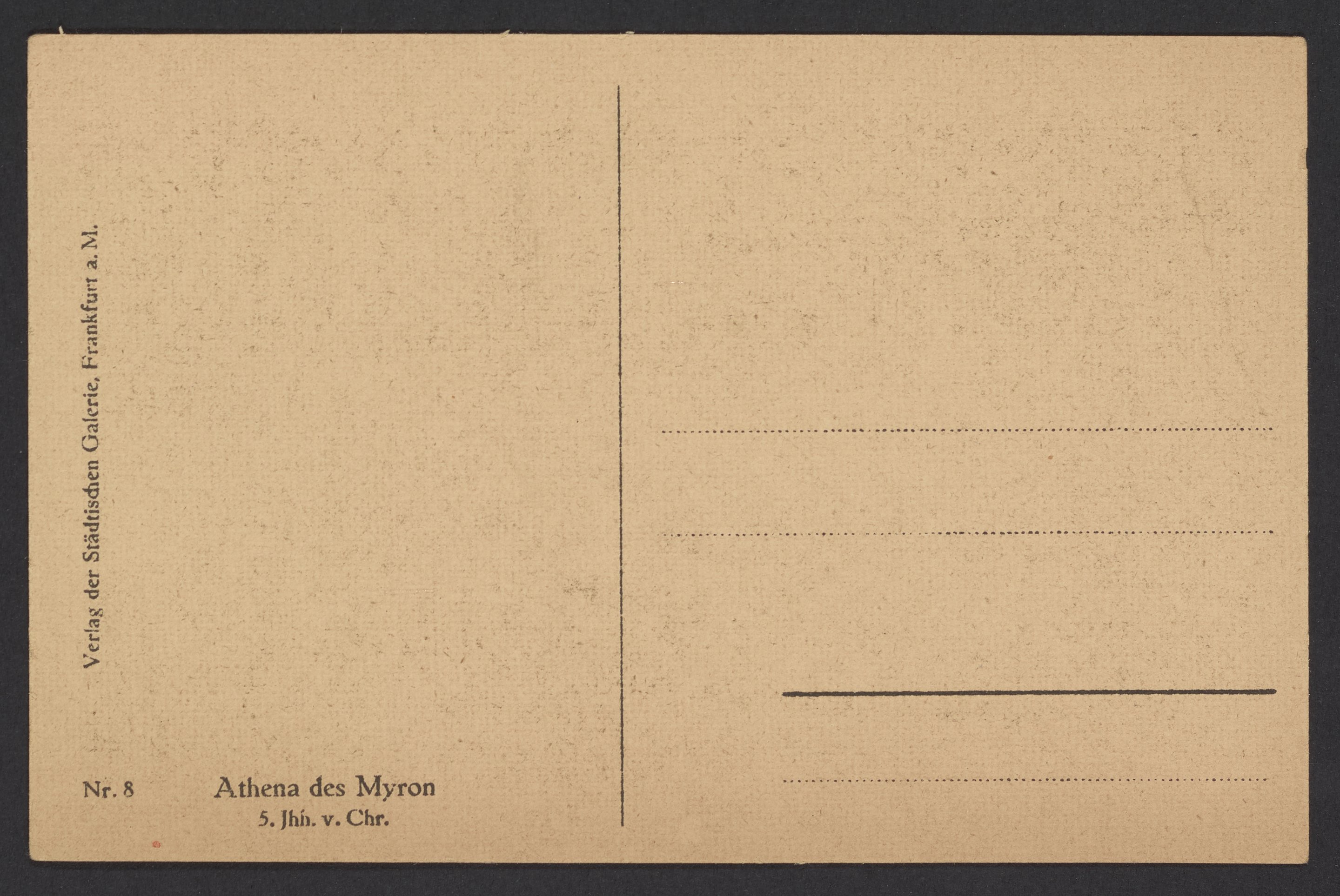 “Blank Postcard of Myron’s Athena.” Städtische Galerie im Städelschen Kunstinstitut Frankfurt am Main, n.d. Papers of Georg and Max Bredig, Box 2, Folder 9. Science History Institute. Philadelphia. https://digital.sciencehistory.org/works/vpbd6b0.
