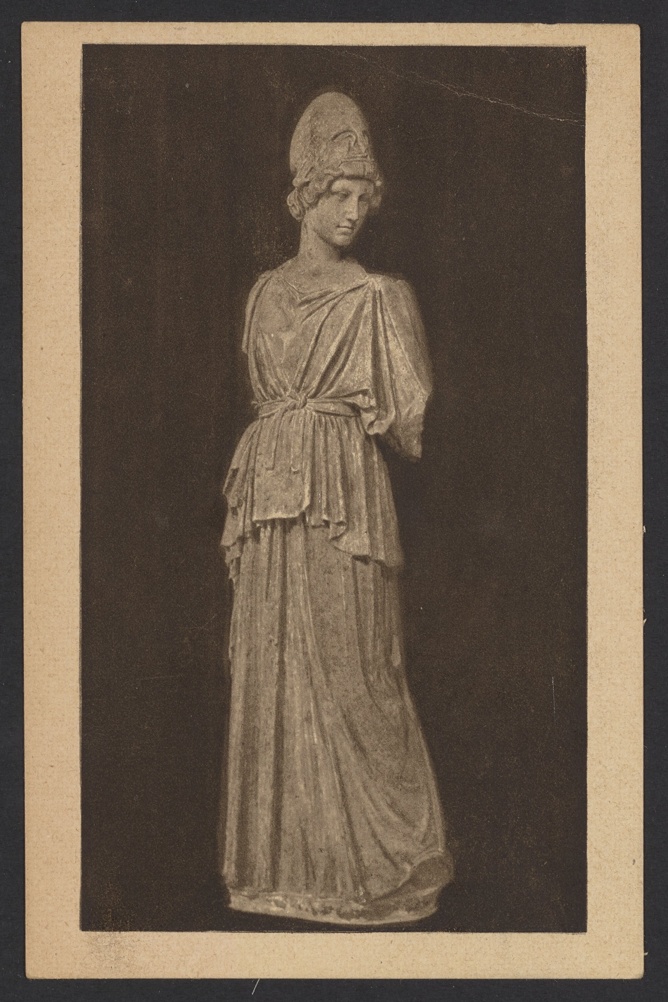 Small JPG1200 x 1800px — 404 KBFull-sized JPG2340 x 3510px — 1.4 MBOriginal fileTIFF — 2340 x 3510px — 23.6 MBBlank postcard featuring an illustration of a statue of the goddess Athena, created by the early classical sculptor Myron (5th cen., B.C.). The artist cast the original sculpture in bronze with another figure of the satyr Marsyas. Both figures were erected on the Athenian Acropolis.