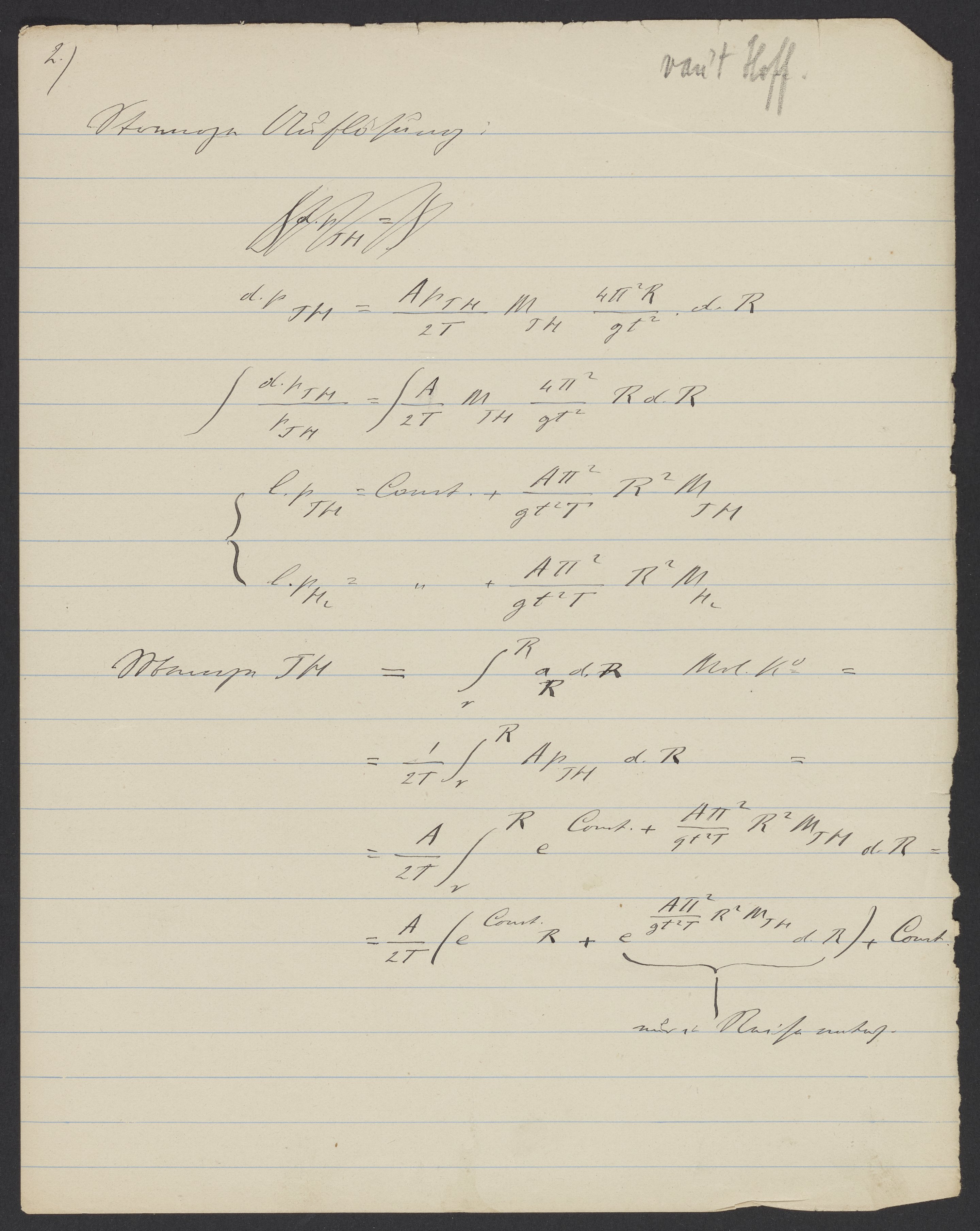 Small JPG1200 x 1498px — 234 KBLarge JPG2880 x 3595px — 1.2 MBFull-sized JPG4190 x 5230px — 2.4 MBOriginal fileTIFF — 4190 x 5230px — 62.8 MBNotes handwritten by Dutch physical chemist, Jacobus H. van’t Hoff (1852-1911). Van’t Hoff was the first winner of the Nobel Prize in chemistry in 1911 and is considered to be one of the lead pioneers of the field of physical chemistry.