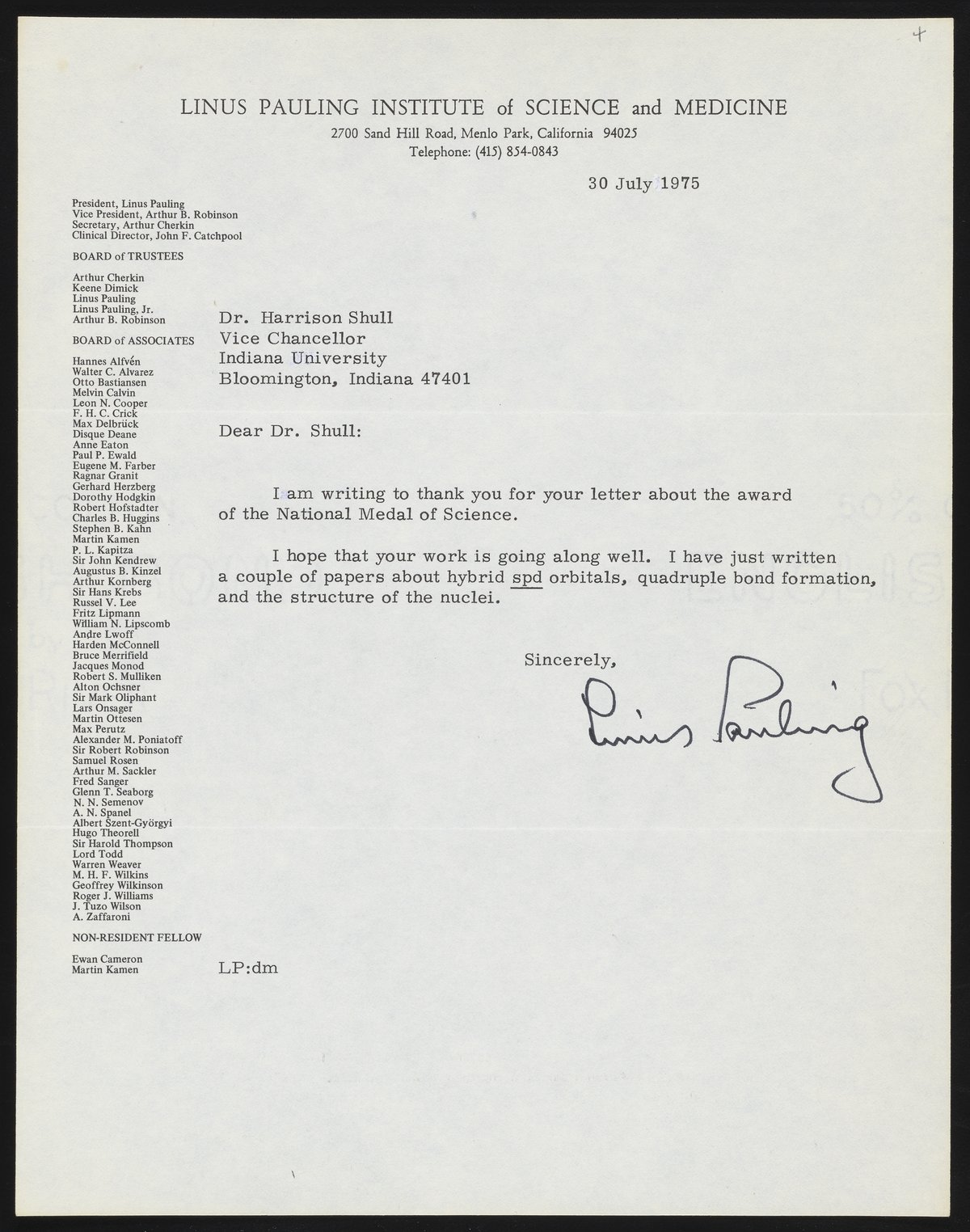 Pauling, Linus. “Letter from Linus Pauling to Harrison Shull, 1975,” July 30, 1975. Robert S. Mulliken & Harrison Shull Correspondence, Box 1. Science History Institute. Philadelphia. https://digital.sciencehistory.org/works/vq27zn474.