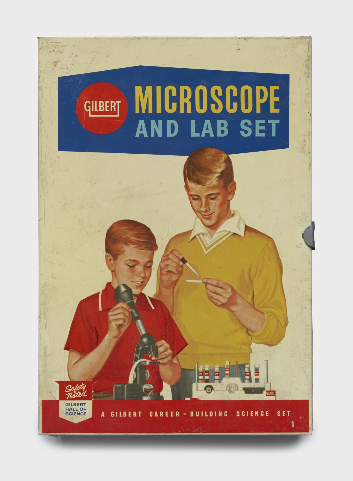 Small JPG1200 x 1200px — 171 KBLarge JPG2880 x 2880px — 689 KBFull-sized JPG7067 x 7067px — 3.5 MBOriginal fileTIFF — 7067 x 7067px — 143 MBWhite metal case with color graphic of two young boys using the Gilbert microscope set. Case opens on a hinge. Inside, a blue styrofoam tray holds a plastic microscope, an electric plug-in light, an objective lens, a sealed test tube containing Oregon Balsam, and a pair of tweezers. Set also includes a "Gilbert Chemistry Order Form", a "Gilbert Microscope Parts Order Form", and an A.C. Gilbert caution tag for the microscope.
