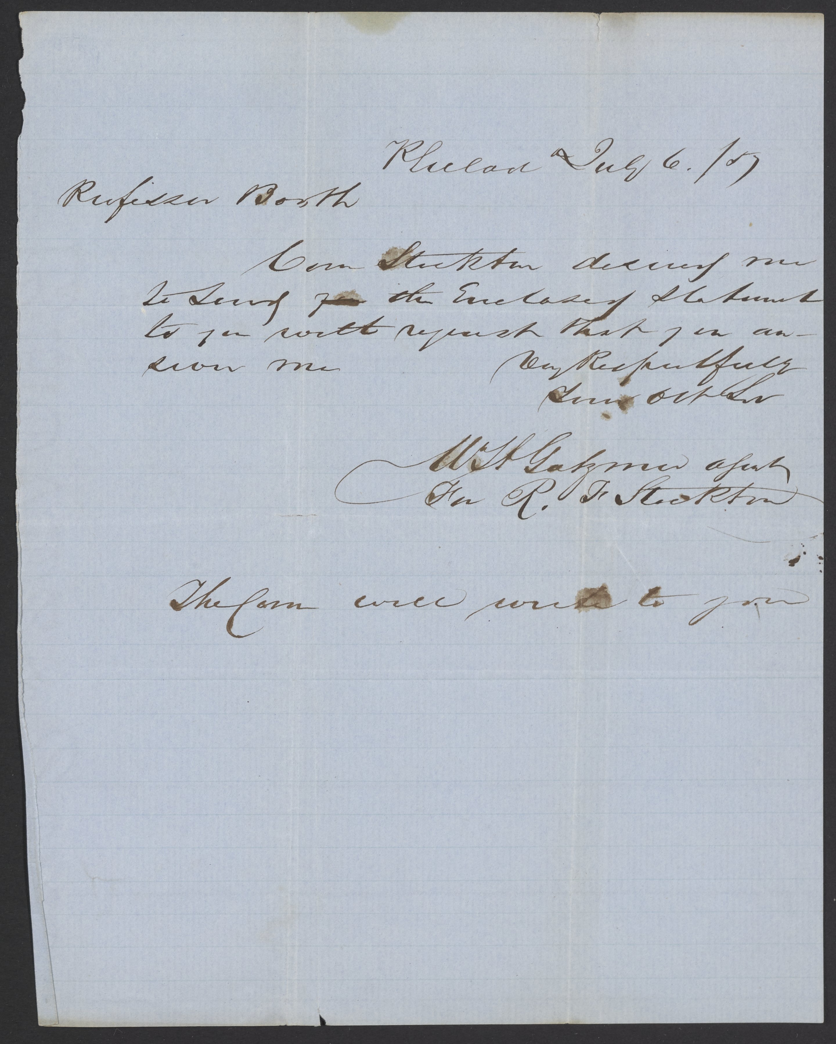 Letter from R. F. Stockton to James Curtis Booth, July 6, 1857
