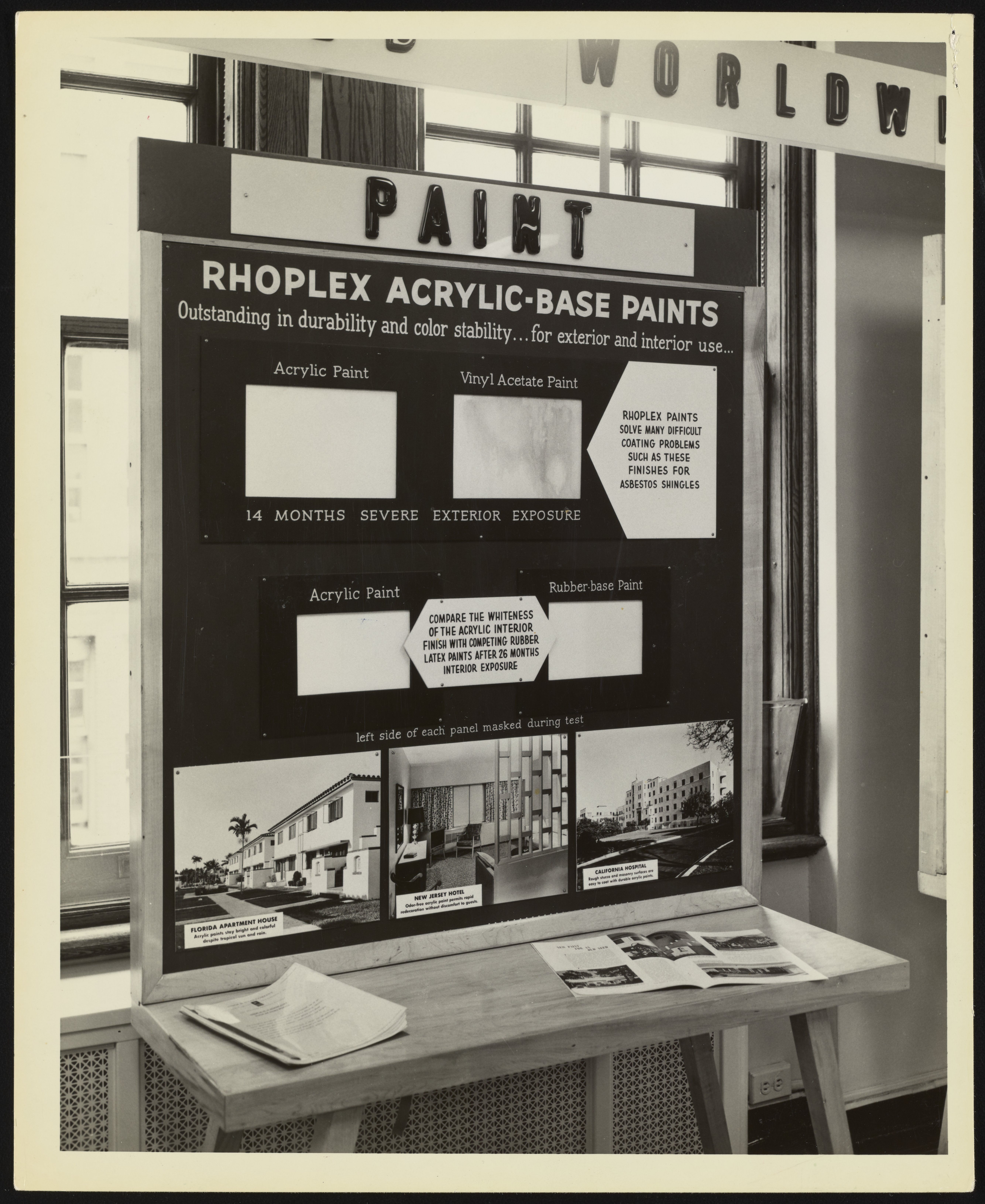 Rohm and Haas Company. “Rhoplex Acrylic-Base Paints Exhibit Board,” April 19, 1956. Rohm & Haas Company Archives, Box Photos 20, Folder 28. Science History Institute. Philadelphia. https://digital.sciencehistory.org/works/vqtktd0.