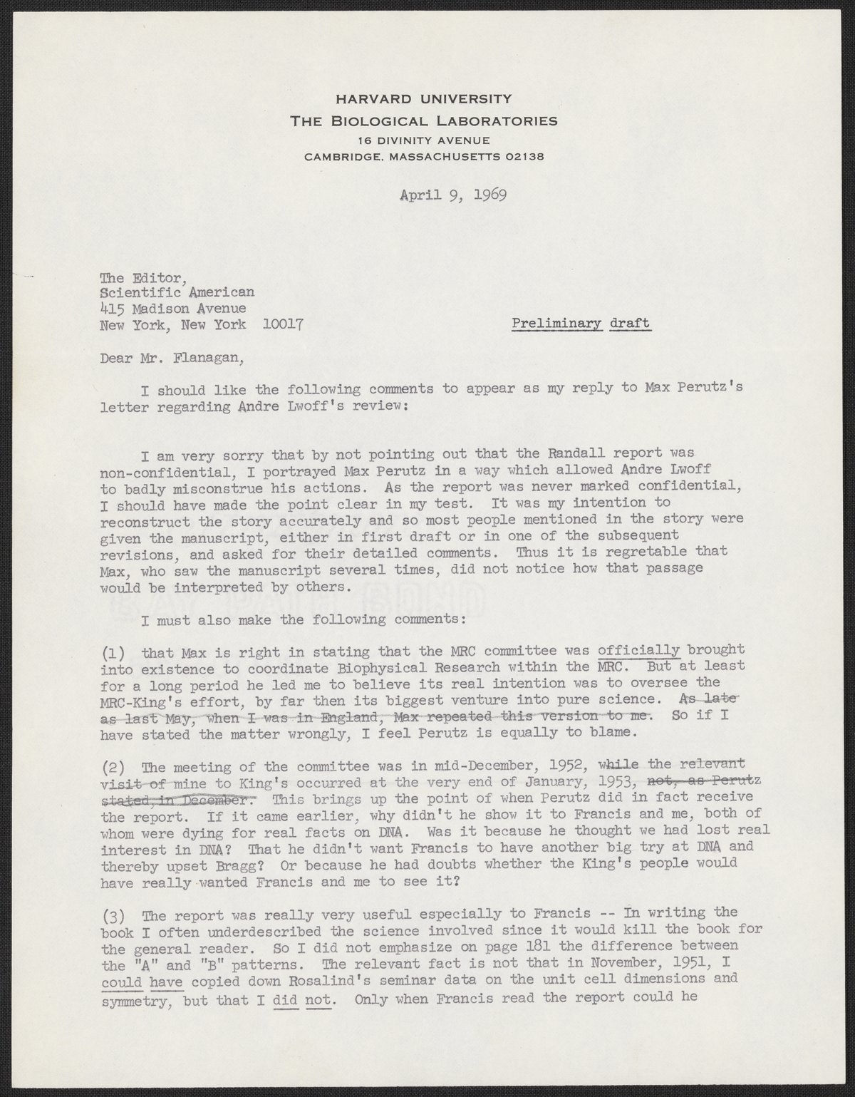 Drafts of a letter from James D. Watson to Dennis Flanagan, April 9, 1969