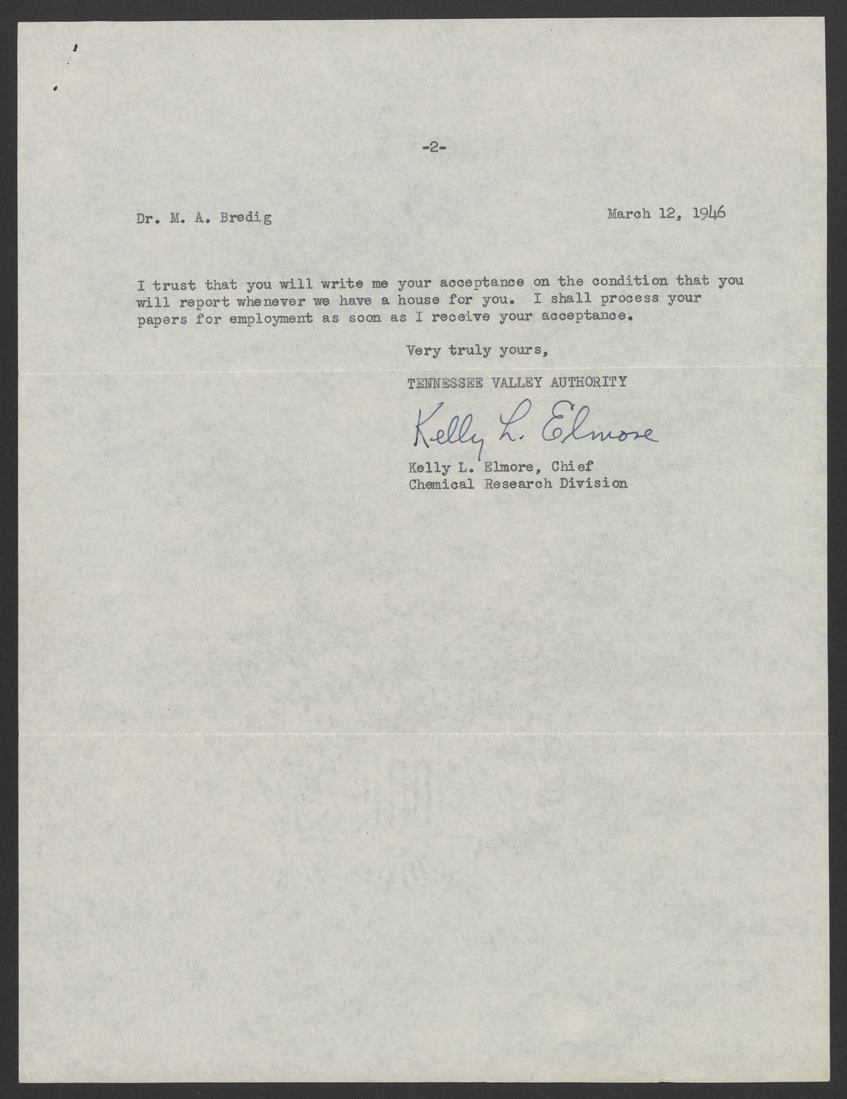 Elmore, Kelly L. “Letter from Kelly L. Elmore to Max Bredig, March 12, 1946,” March 12, 1946. Papers of Georg and Max Bredig, Box 10, Folder 34. Science History Institute. Philadelphia. https://digital.sciencehistory.org/works/vrmbgg5.