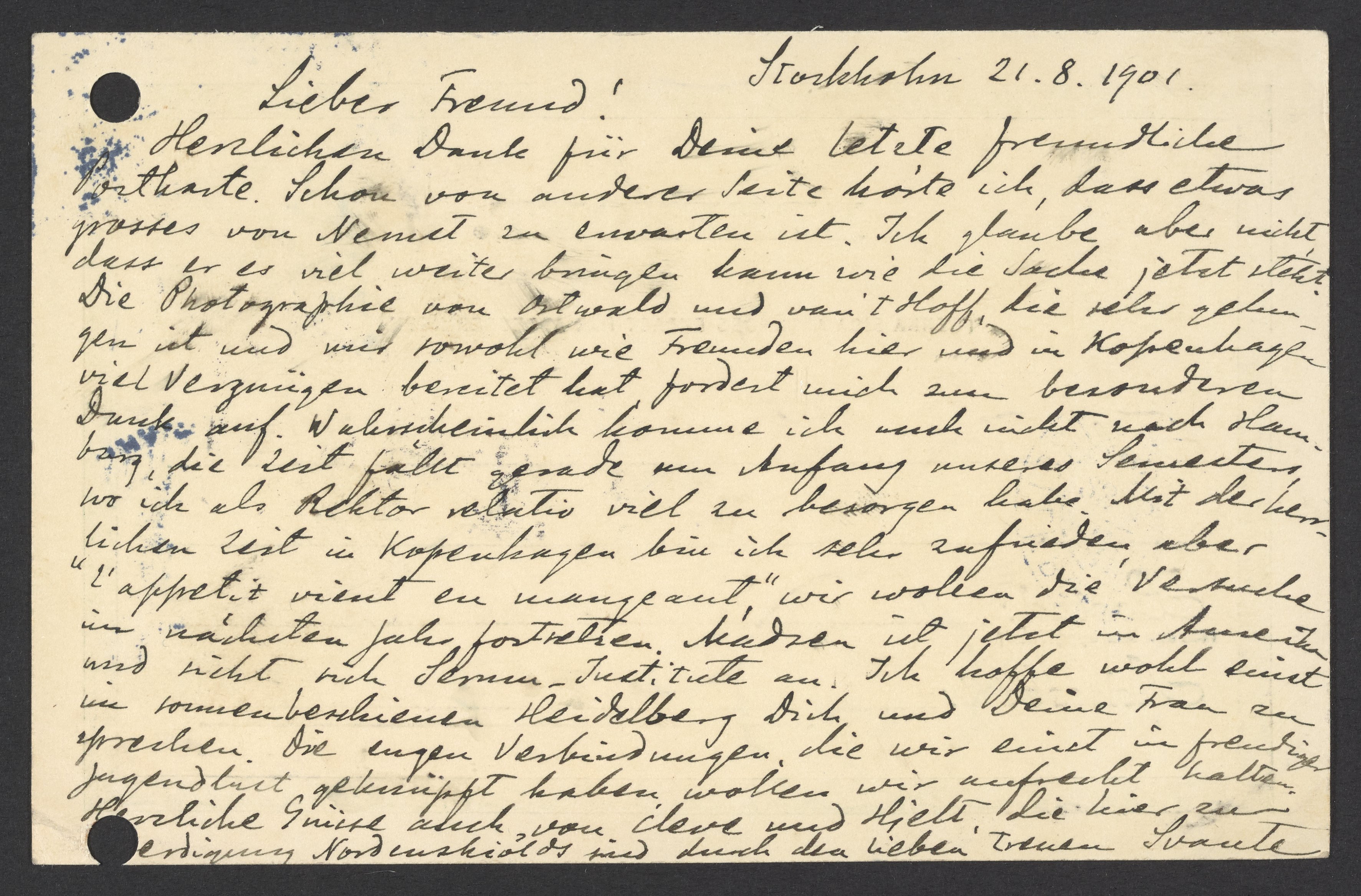 Herzlich Dank für Deine letzte freundliche Postkarte. Schon von anderer Seite hörte ich, dass etwas sprosses von Nernst zu erwarten ist. Ich glaube aber nicht, dass er es viel weiter bringen kann wie die Sache jetzt steht. Die Photographie von Ostwald und van’t Hoff, die sehr gelegen ist und mir sowohl wie Freunden hier und in Kopenhagen viel Vergnügen bereitet hat fordert mich zum besonderen Druck auf. Wahrscheinlich komme ich auch nicht nach Hamburg, die Zeit fällt gerade am Anfang unseres Semesters, wo ich als Rektor relativ viel zu besorgen habe. Mit der herrlichen Zeit in Kopenhagen bin ich sehr zufrieden, aber „l’appetit vient en mange aut,“ wir wollen die Versuche im nächsten Jahr fortsetzen. Auden ist jetzt in Amerika und nicht sich Semm-Institute an. Ich hoffe wohl einst im sommerbeschienen Heidelberg Dich und Deine Frau zu sprechen. Die eingen Verbindungen, die wir einst in freudiger Jugendzeit genkünpft haben, wollen wir aufrecht halten. Herzliche Grüsse von Cleve und Hielt, die hier zur Beerdigung Nordenskiölds sind durch die lieben Trauen Svante