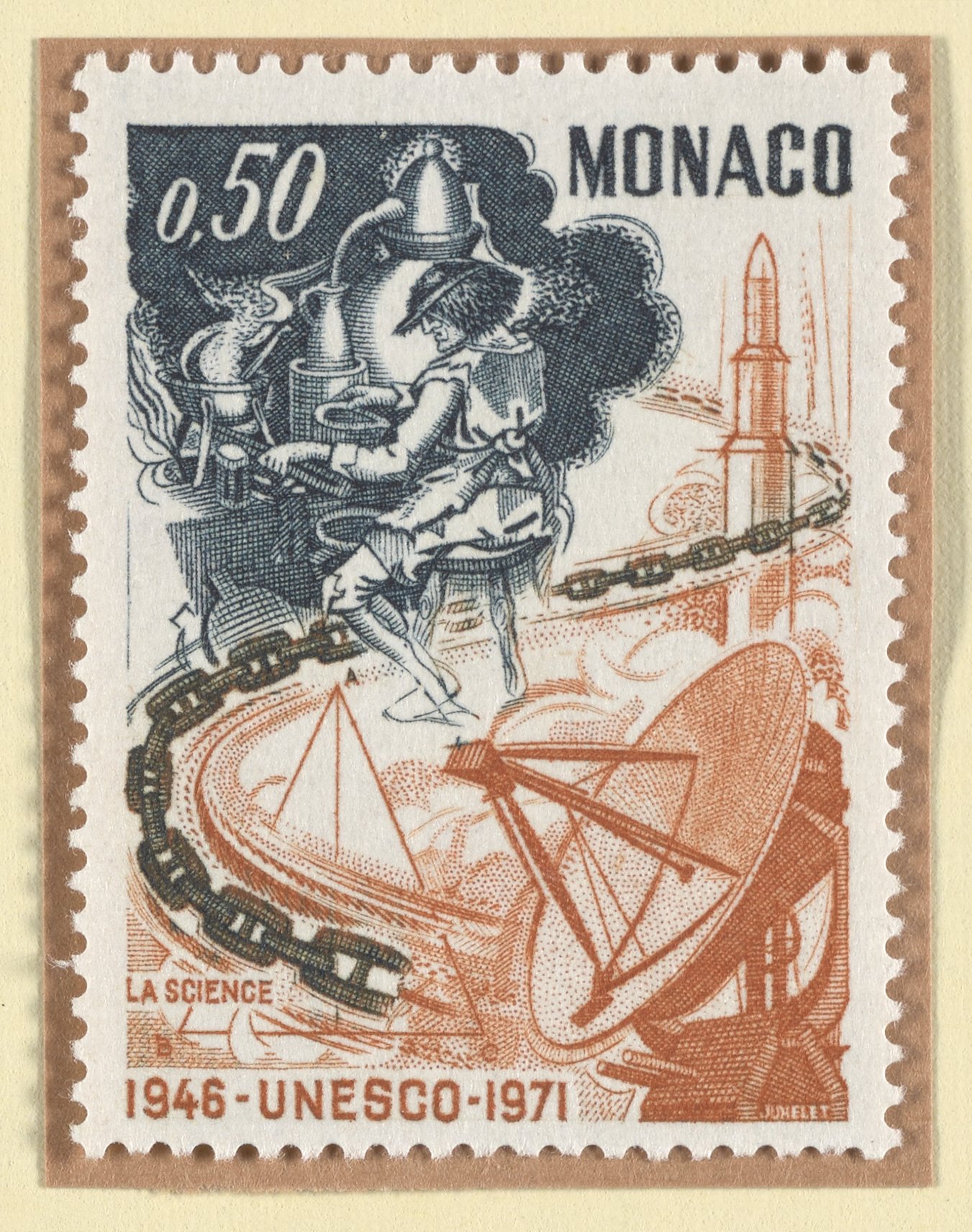 Claude Jumelet. “Postage Stamp from Monaco Commemorating Science and the 25th Anniversary of UNESCO.” Monaco, September 6, 1971. Witco Stamp Collection, Box 1. Science History Institute. Philadelphia. https://digital.sciencehistory.org/works/vt150j31m.
