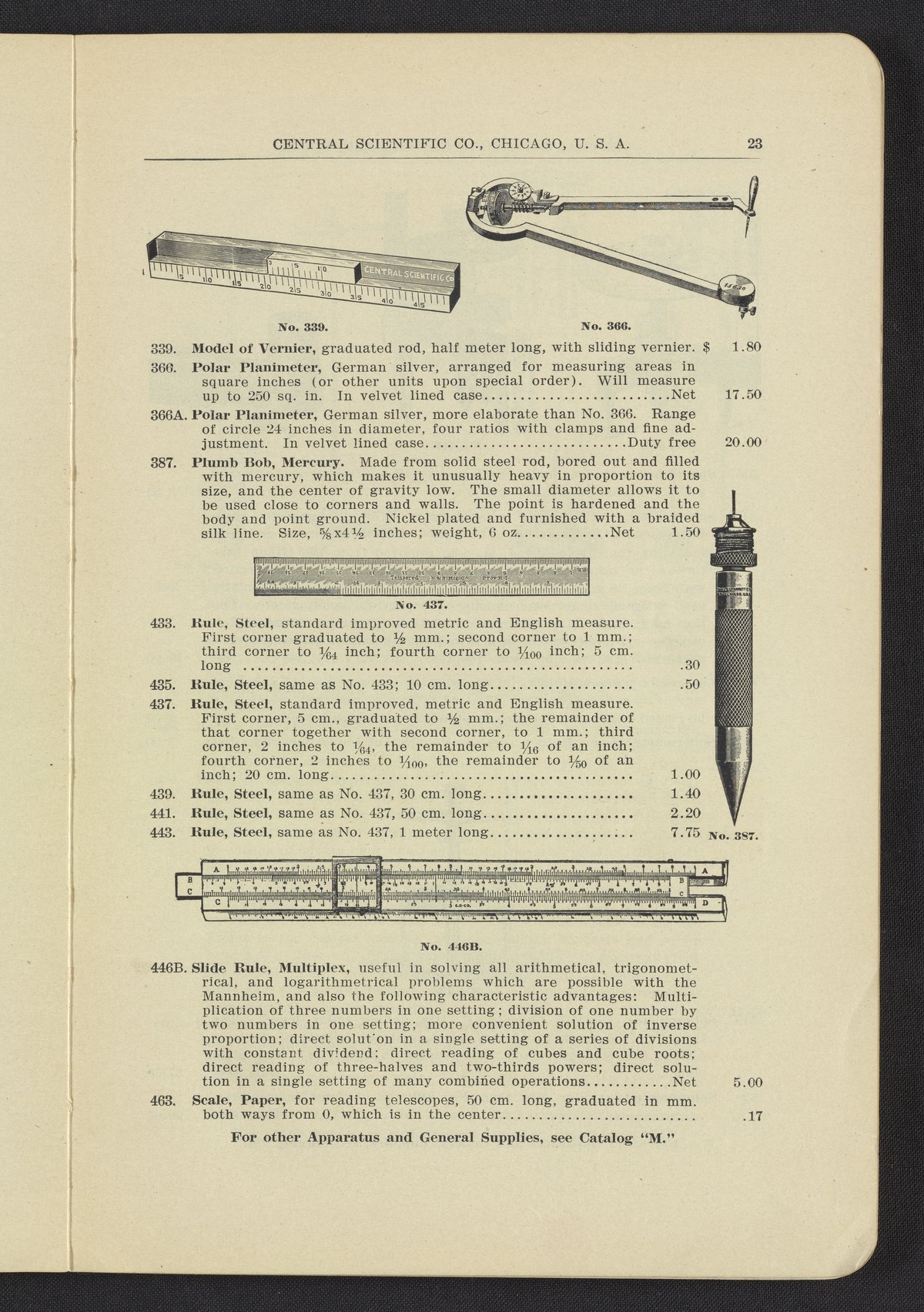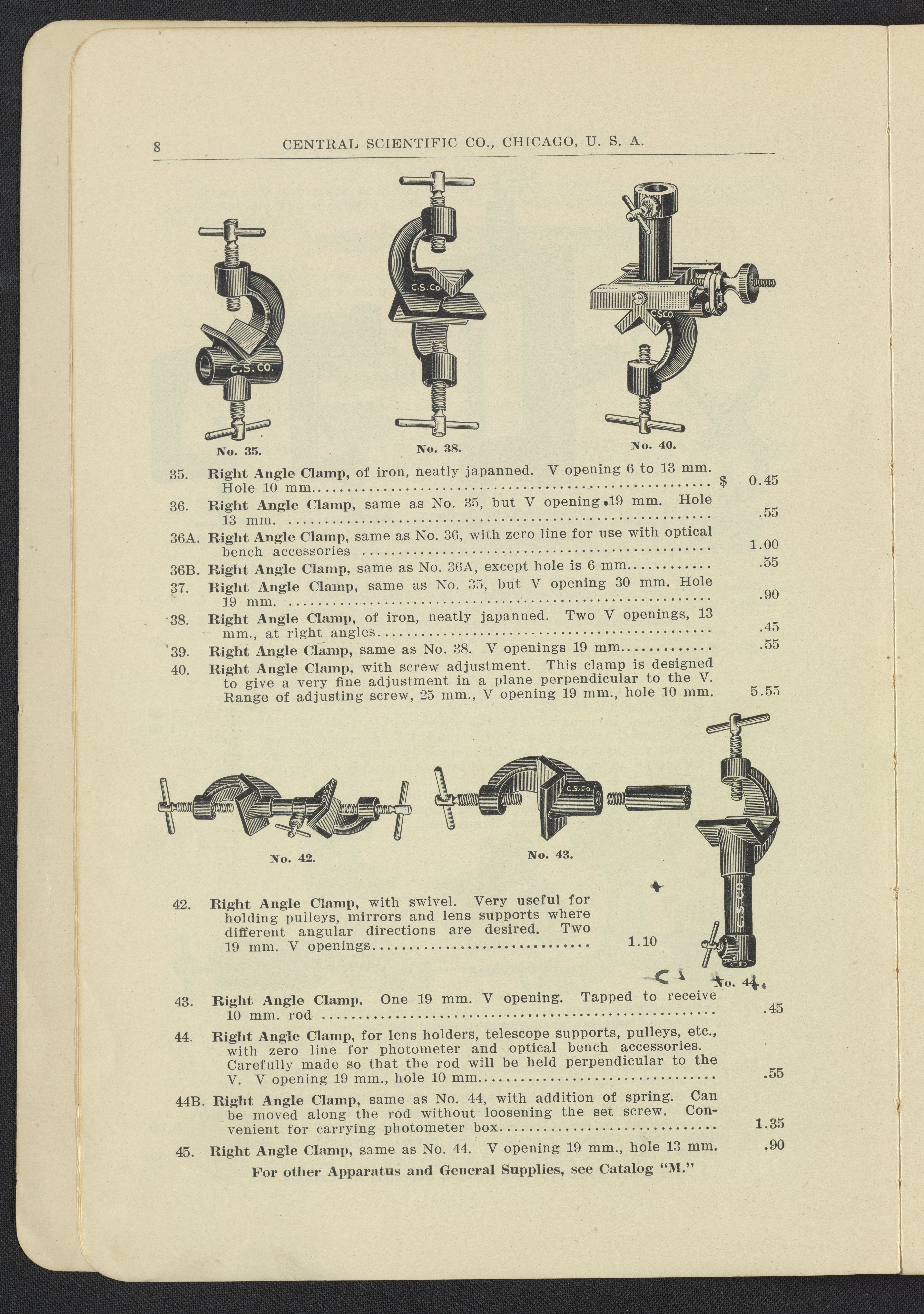 Central Scientific Company. “Physical Apparatus for Universities and Colleges Manufactured and Imported by Central Scientific Co.” Chicago, Illinois: Central Scientific Company, 1912. Q185.7 .C46 1912. Science History Institute. Philadelphia. https://digital.sciencehistory.org/works/vt150k323.