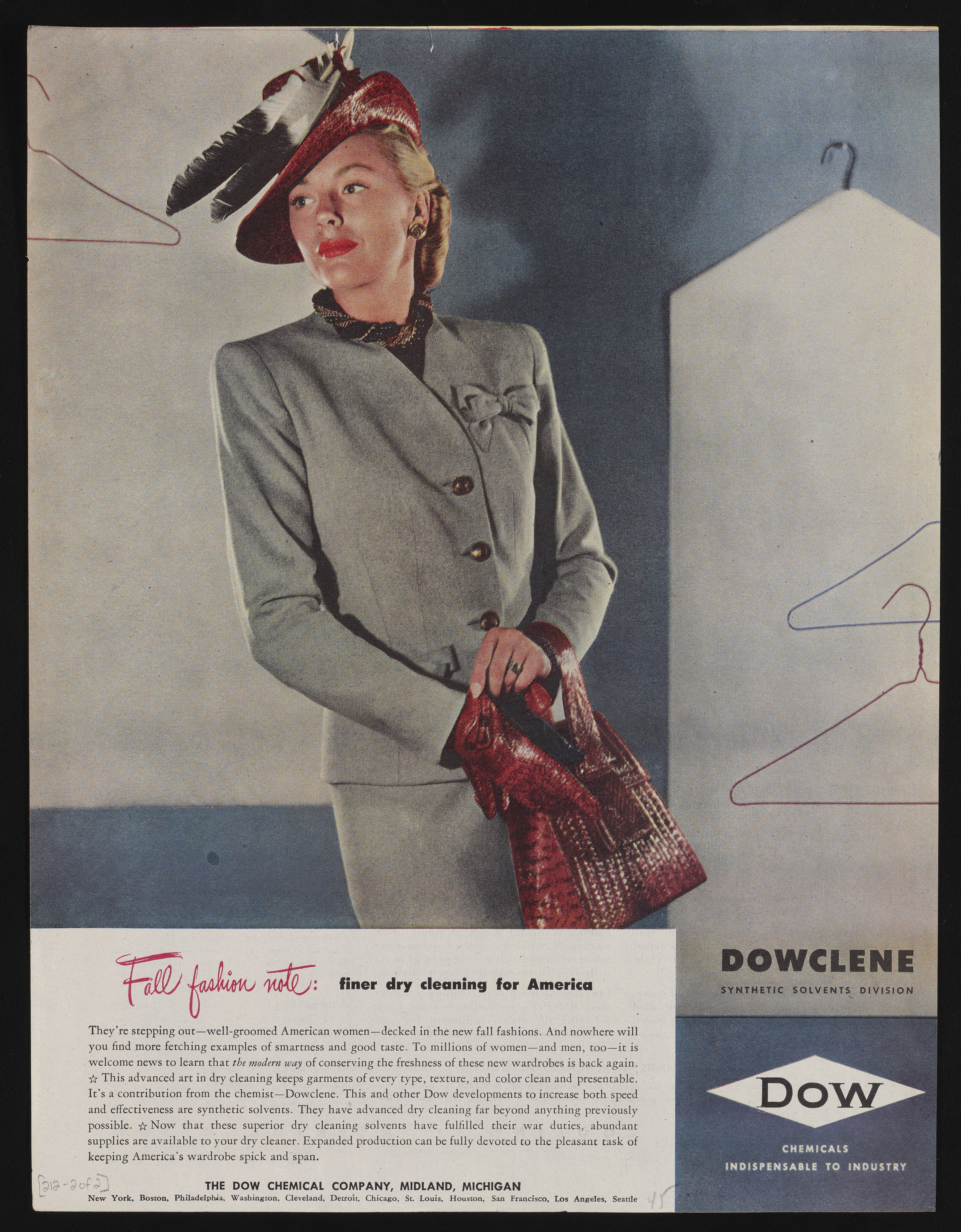 Dow Chemical Company. “Fall Fashion Note: Finer Dry Cleaning for America,” 1945. Advertisements from the Dow Chemical Historical Collection, Box 7. Science History Institute. Philadelphia. https://digital.sciencehistory.org/works/vu42ld9.