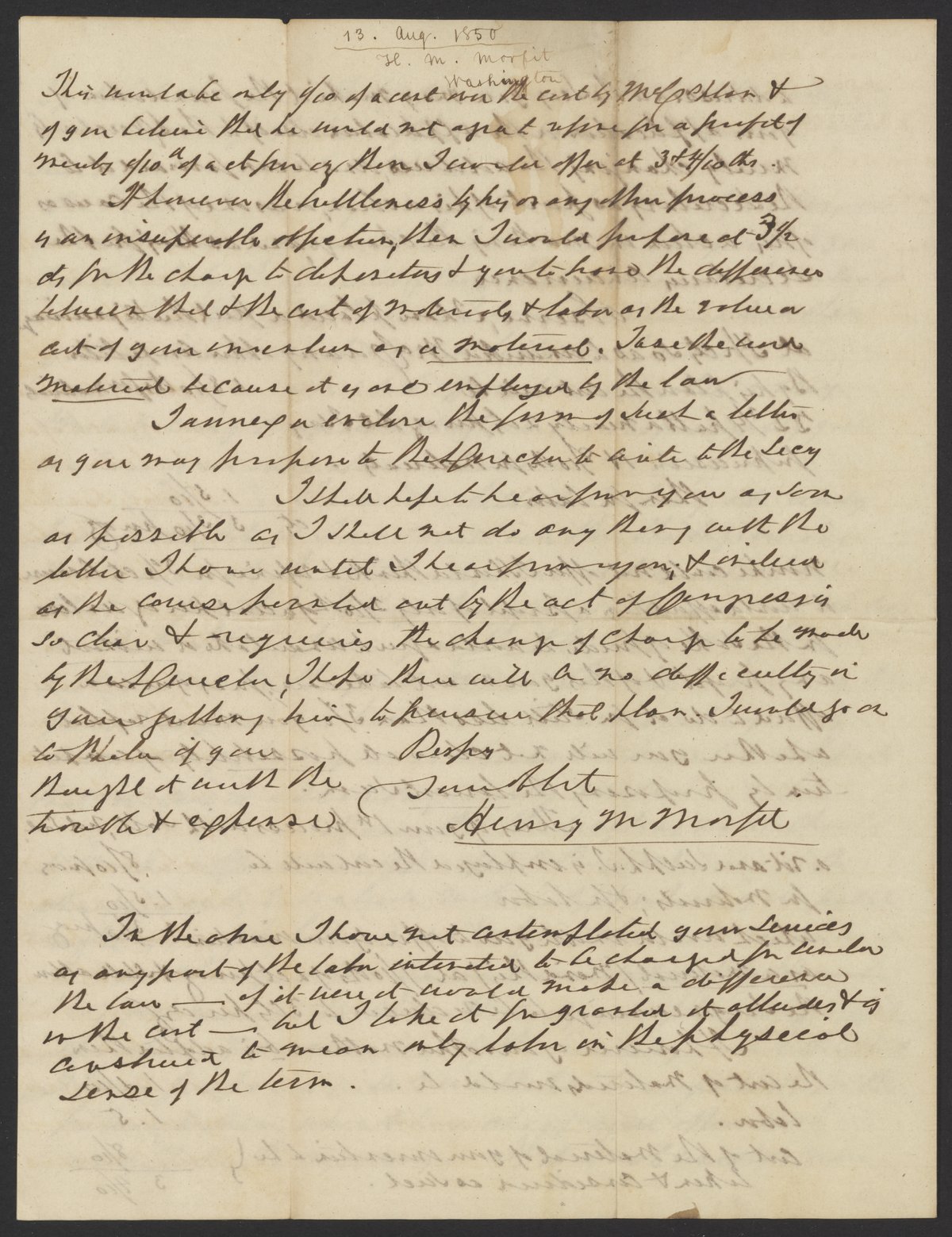 Letter 1 of 2 from Henry M. Morfit to James Curtis Booth, August 13, 1850