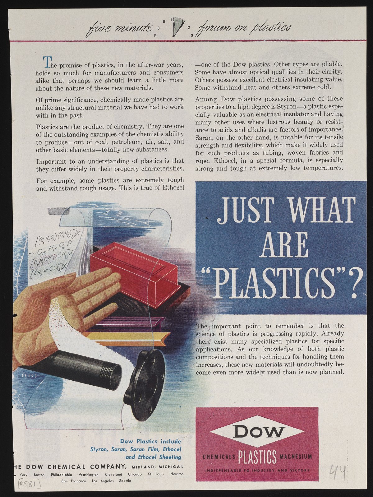 Dow Chemical Company. “Just What Are ‘Plastics?",” 1944. Advertisements from the Dow Chemical Historical Collection, Box 9. Science History Institute. Philadelphia. https://digital.sciencehistory.org/works/vvbdm8x.