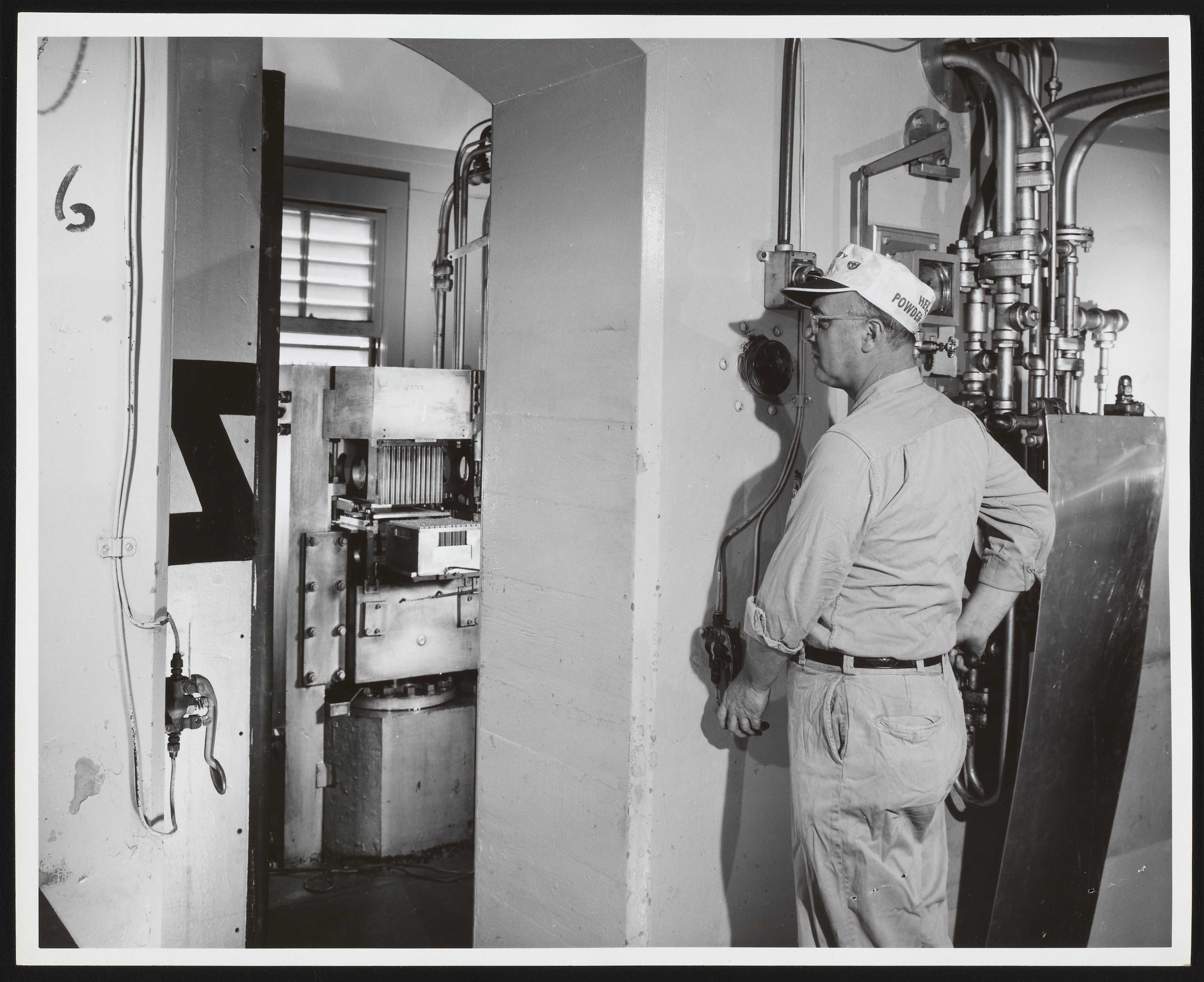 General view of employee Kenneth Newell operating a press machine used to fill electric blasting caps with an explosive charge at the Hercules Powder Company plant in Port Ewen, New York. The operation was remote-controlled and, per notations accompanying the photograph, the machine typically operated behind a concrete barricade, which is open here for the purposes of the photograph.