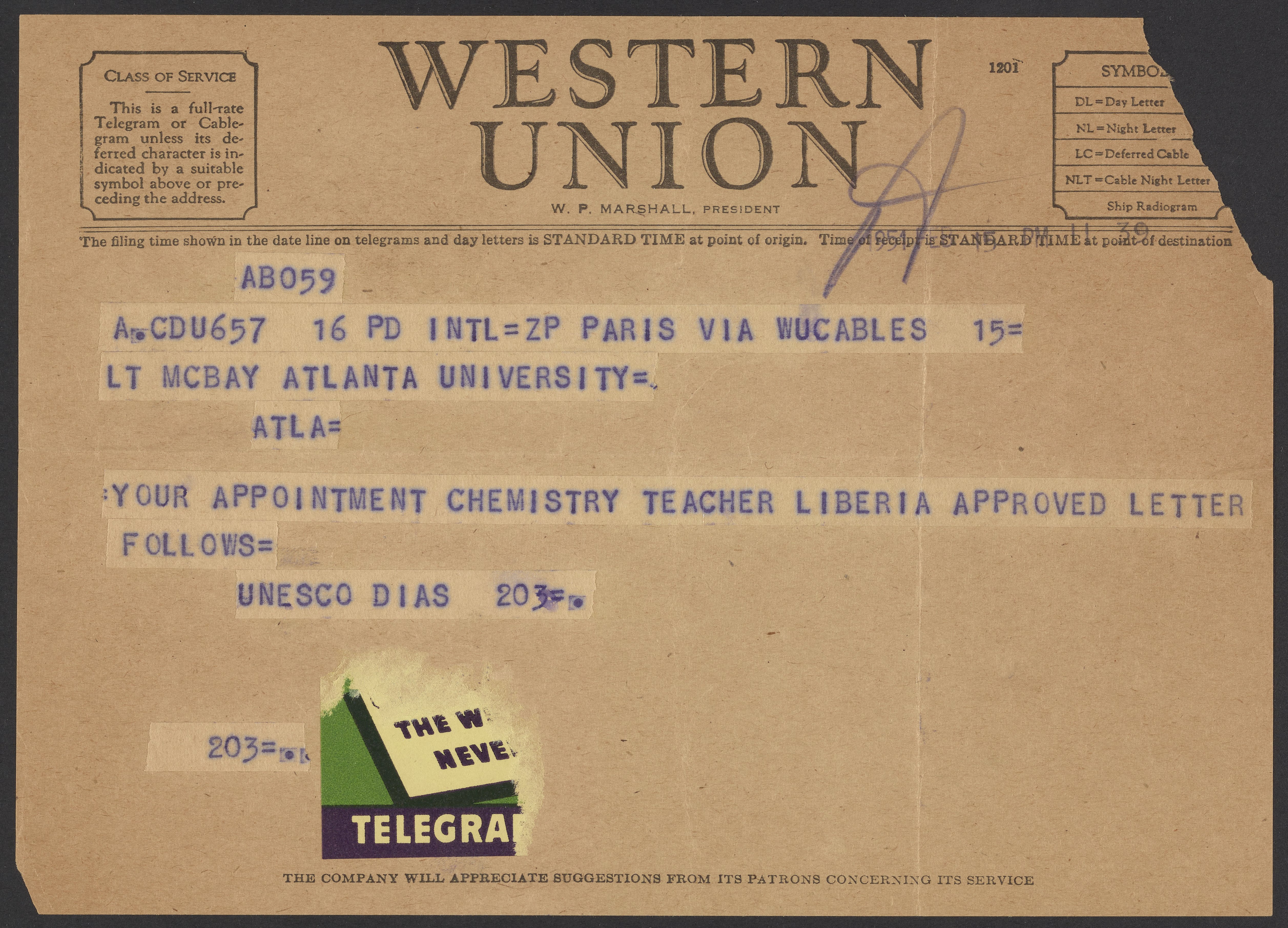 Telegram confirming the appointment of Henry McBay (1914-1995) as a chemistry professor at Liberia College. In 1951, McBay developed a chemistry education program in Liberia on behalf of the United Nations Education, Scientific, and Cultural Organization (UNESCO).