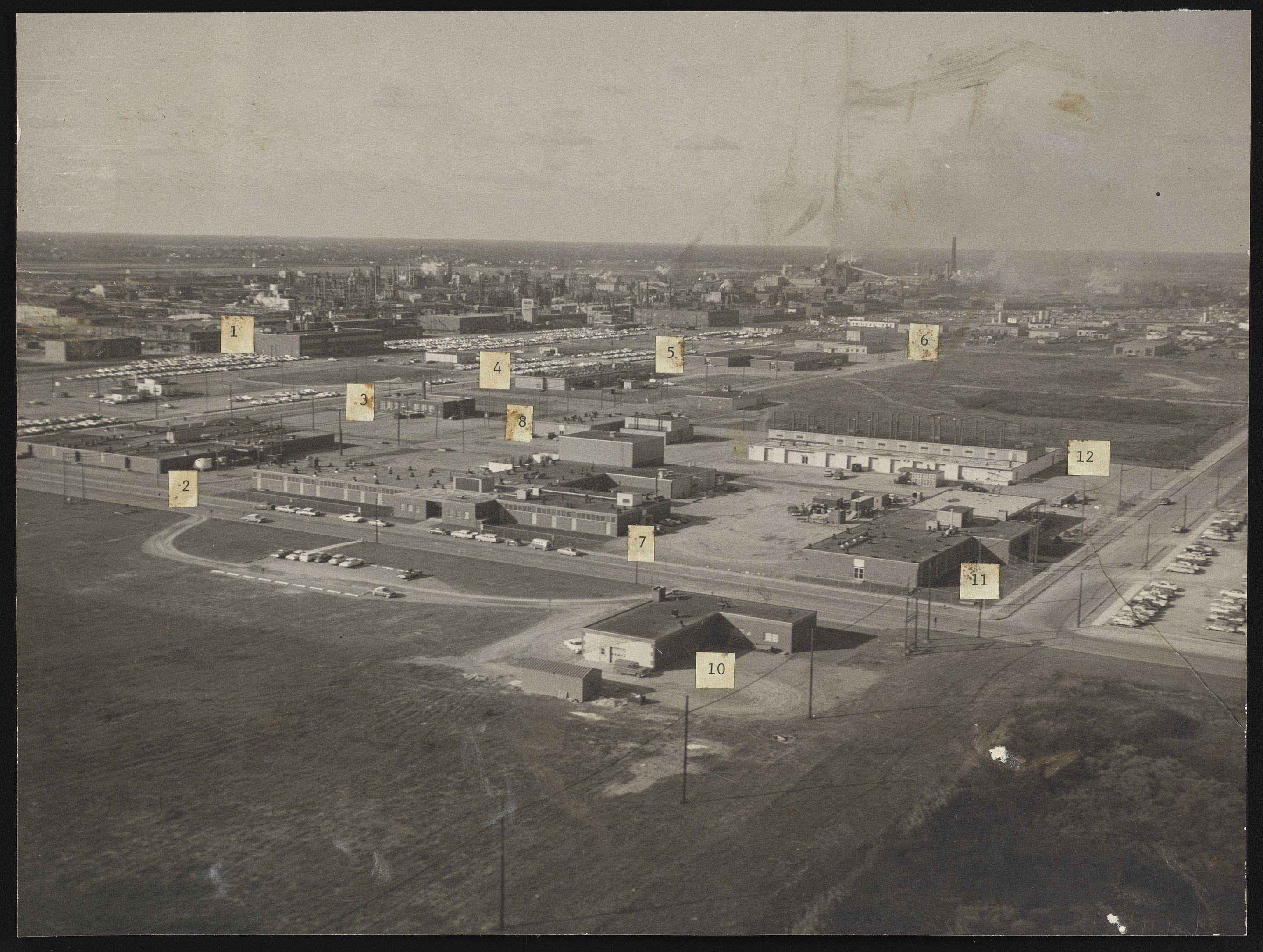 Aerial view of the Dow Chemical Company Research Center located in Midland, Michigan. Various buildings are numbered and identified as follows on the back of the photograph: