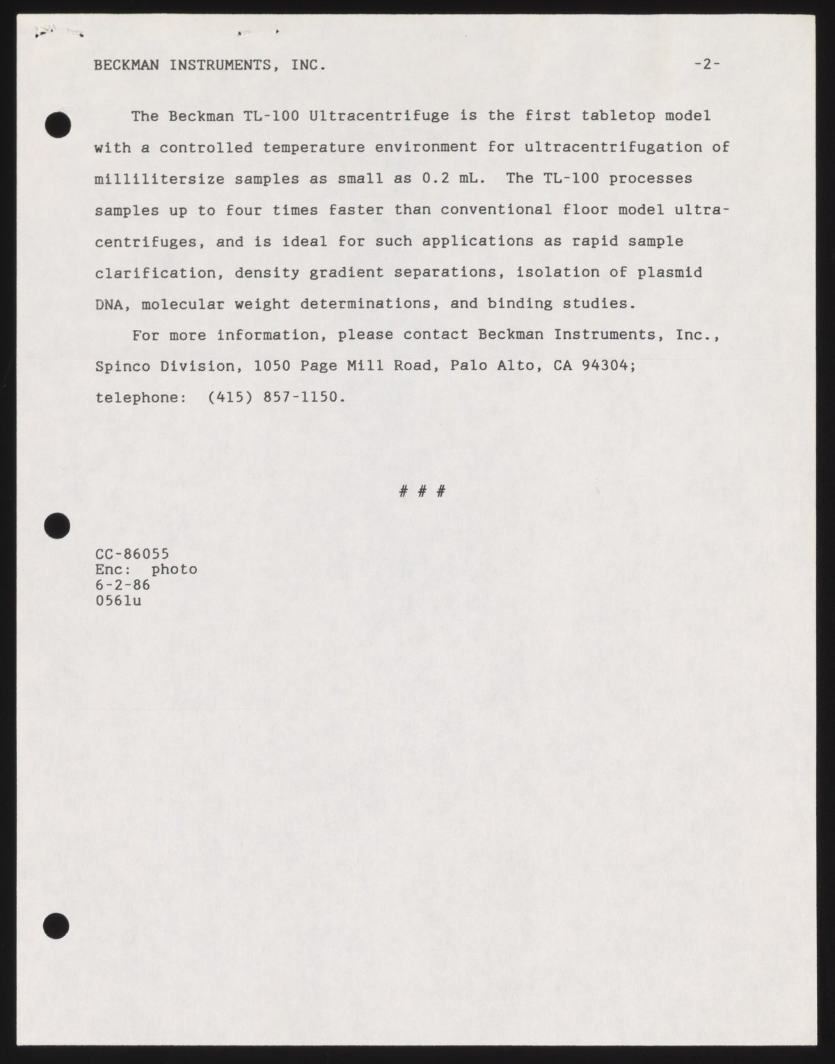 Eastman, Elke. “Beckman Introduces New Rotor for Model TL-100 Tabletop Ultracentrifuge,” June 2, 1986. Beckman Historical Collection, Box 58, Folder 71. Science History Institute. Philadelphia. https://digital.sciencehistory.org/works/w0892b41m.