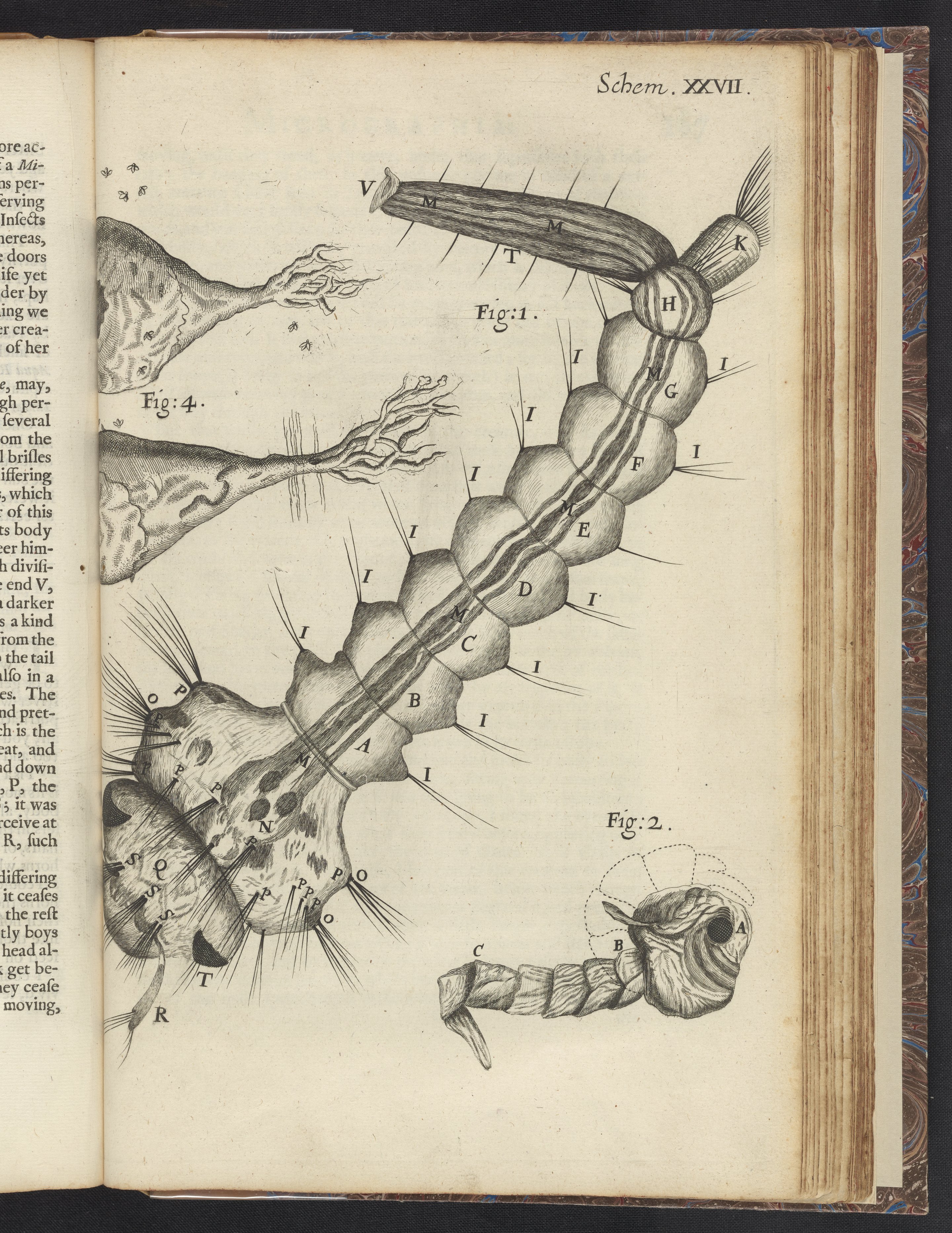 Engravings of a water-insect or gnat from Schem. 27 of the first edition of Robert Hooke's seminal volume, Micrographia : or, Some physiological descriptions of minute bodies made by magnifying glasses. With observations and inquiries thereupon.