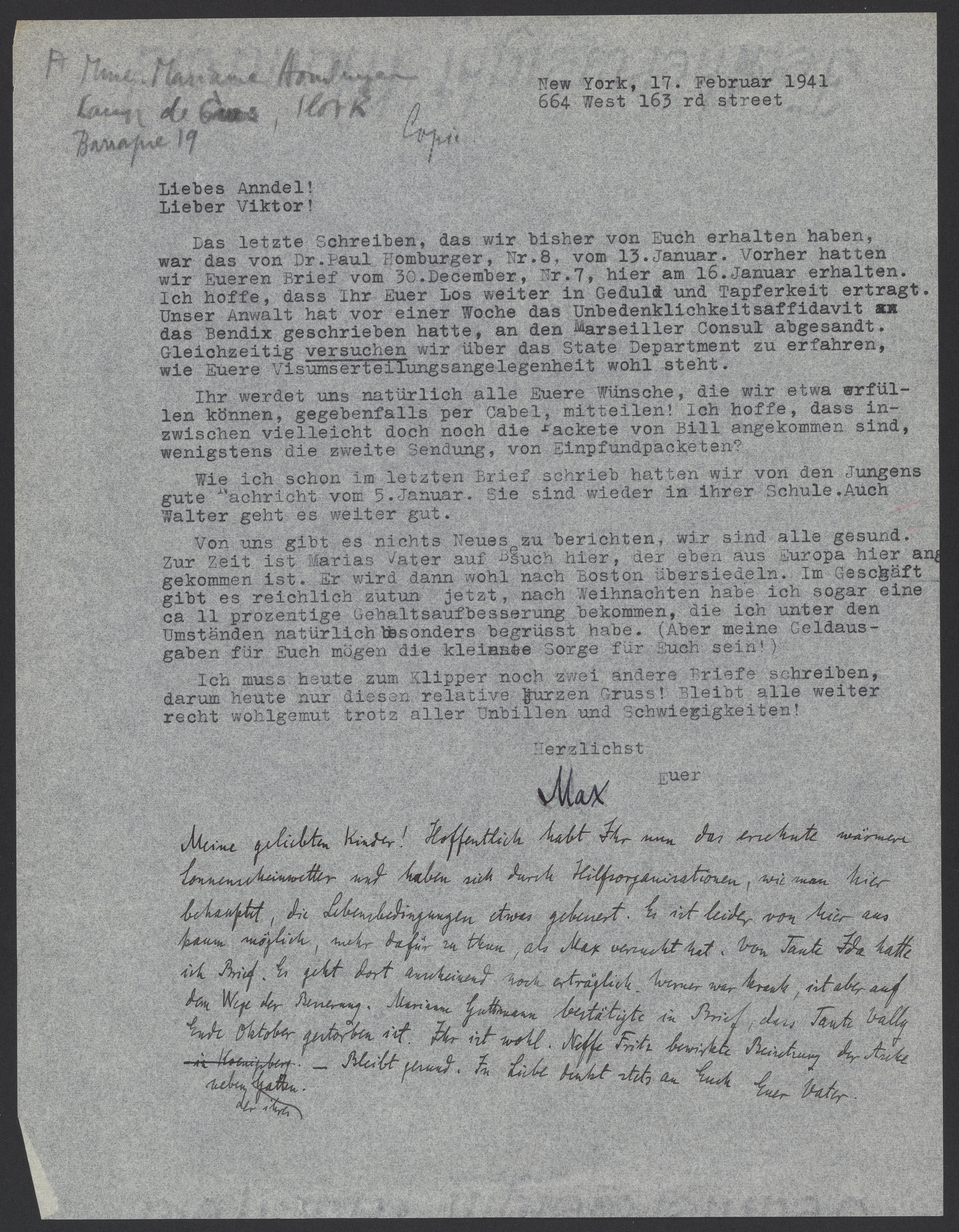 Das letzte Schreiben, das wir bisher von Euch erhalten haben, war das von Dr. Paul Homburger, Nr. 8 vom 13. Januar. Vorher hatten wir Eueren Brief vom 30. Dezember, Nr. 7, hier am 16. Januar erhalten. Ich hoffe, dass Ihr Euer Los weiter in Geduld und Tapferkeit ertragt. Unser Anwalt hat vor einer Woche das Unbedenklichkeitsaffidavit, das Bendix geschrieben hatte, an den Marseiller Consul abgesandt. Gleichzeitig versuchen wir über das State Department zu erfahren, wie Euere Visumserteilungsangelegenheit wohl steht.