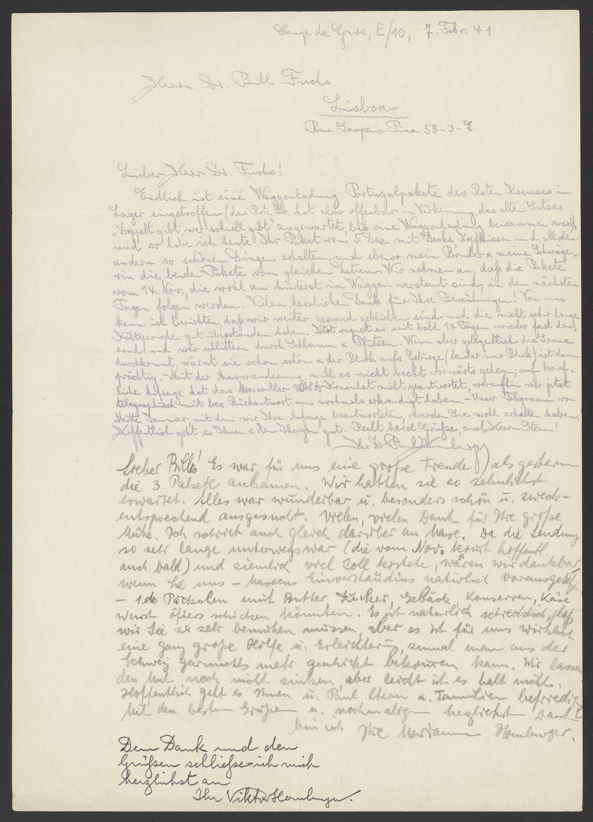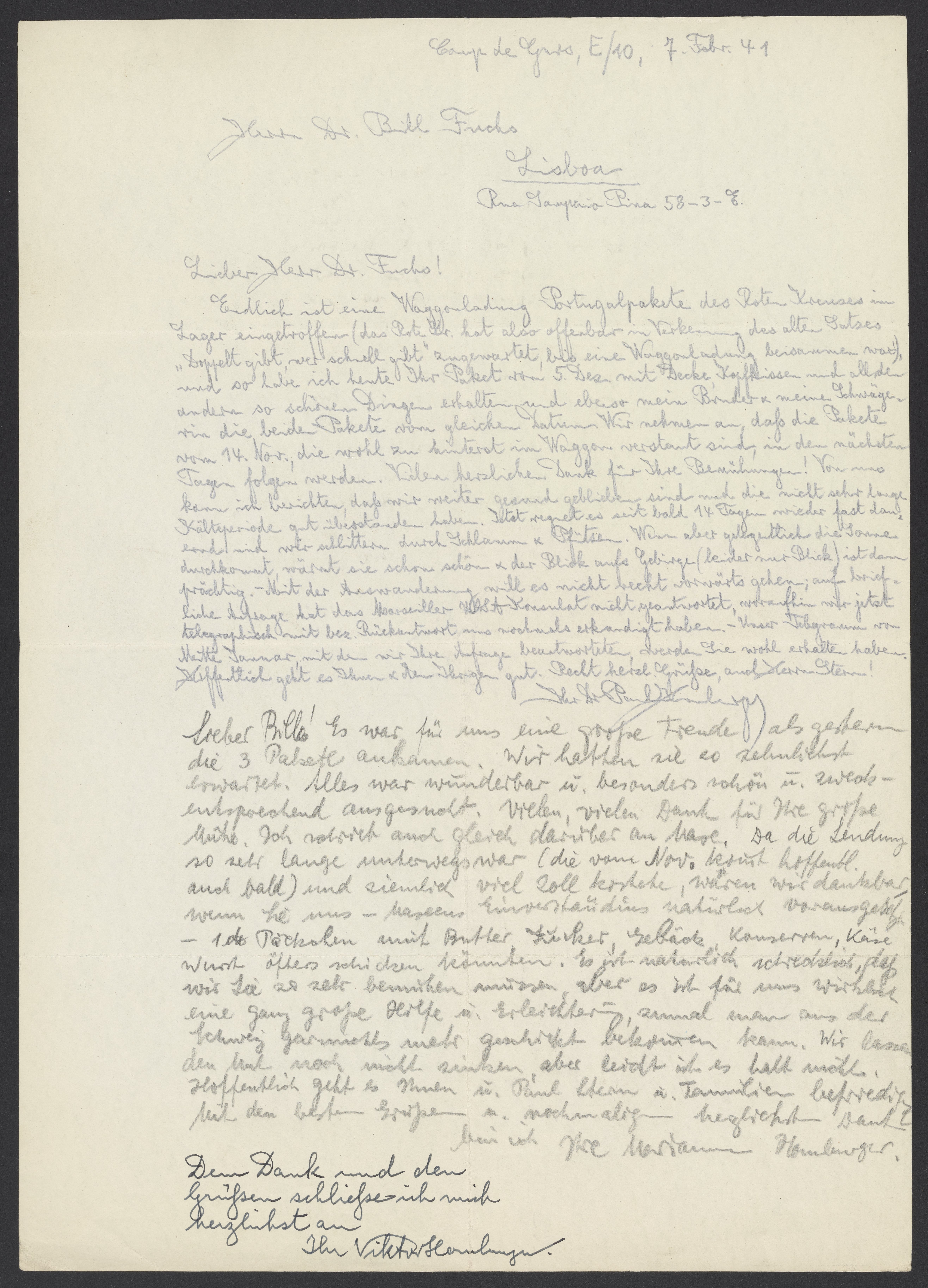 Endlich ist eine Waggonladung Portugalpakete des Roten Kreuzes im Lager eingetroffen (das Rote Kr. hat also offenbar in Verkennung des alten Satzes „Doppelt gibt, wer schnell gibt“ zugewartet, bis eine Waggonladung beisammen war!“), und so habe ich heute Ihr Paket vom 5. Dez mit Decke, Kopfkissen und all den anderen so schönen Dingen erhalten und ebenso mein Bruder und meine Schwägerin die beide Pakete vom gleichen Datum. Wir nehmen an, daß die Pakete vom 14. Nov., die wohl zu hinterst im Waggon verstaut sind, in den nächsten Tagen folgen werden. Vielen herzlichen Dank für Ihre Bemühung! Von uns kann ich berichten, daß wir weiter gesund geblieben sind und die nicht sehr lange Kälteperiode gut überstanden haben. Jetzt regnet es seit bald 14 Tagen wieder fast dauernd und wir schlittern durch Schlamm & Pfützen. Wenn aber gelegentlich die Sonne durchkommt, wärmt sie schon schön & der Blick aufs Gebirge (leider nur Blick) ist dann prächtig. – Mit der Auswanderung will es nicht recht vorwärts gehen; auf briefliche Anfrage hat das Marseiller USA Konsulat nicht geantwortet, woraufhin wir jetzt telegraphisch mit bez. Rückantwort uns nochmals erkundigt haben. – Unser Telegramm von Mitte Januar, mit dem wir Ihre Anfrange beantworteten, werden Sie wohl erhalten haben. Hoffentlich geht es Ihnen & den Ihrigen gut. Recht herzl. Grüße, und Herrn Stern!