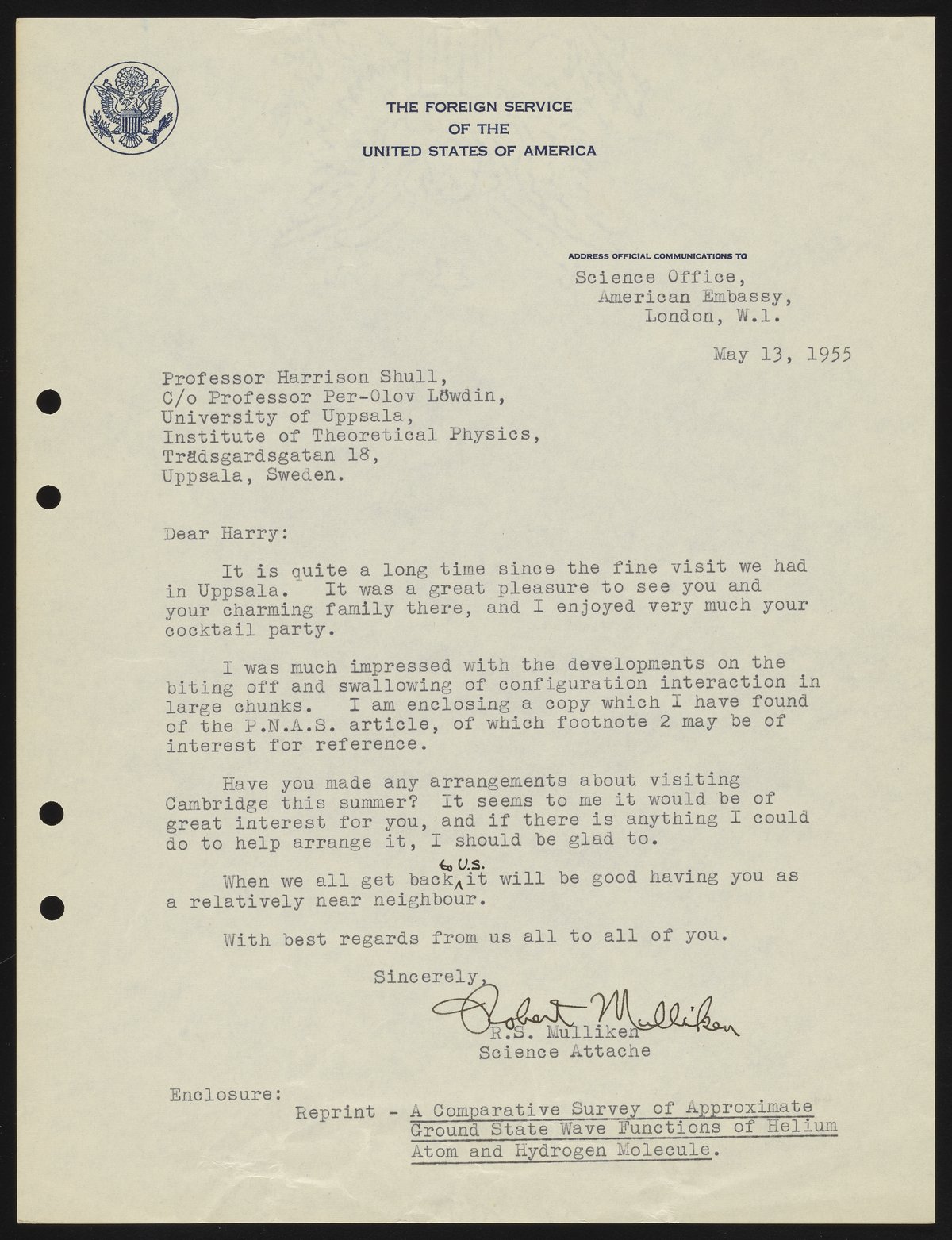 Mulliken, Robert Sanderson. “Letter from Robert S. Mulliken to Harrison Shull, 1955,” May 13, 1955. Robert S. Mulliken & Harrison Shull Correspondence, Box 1. Science History Institute. Philadelphia. https://digital.sciencehistory.org/works/w3763685q.