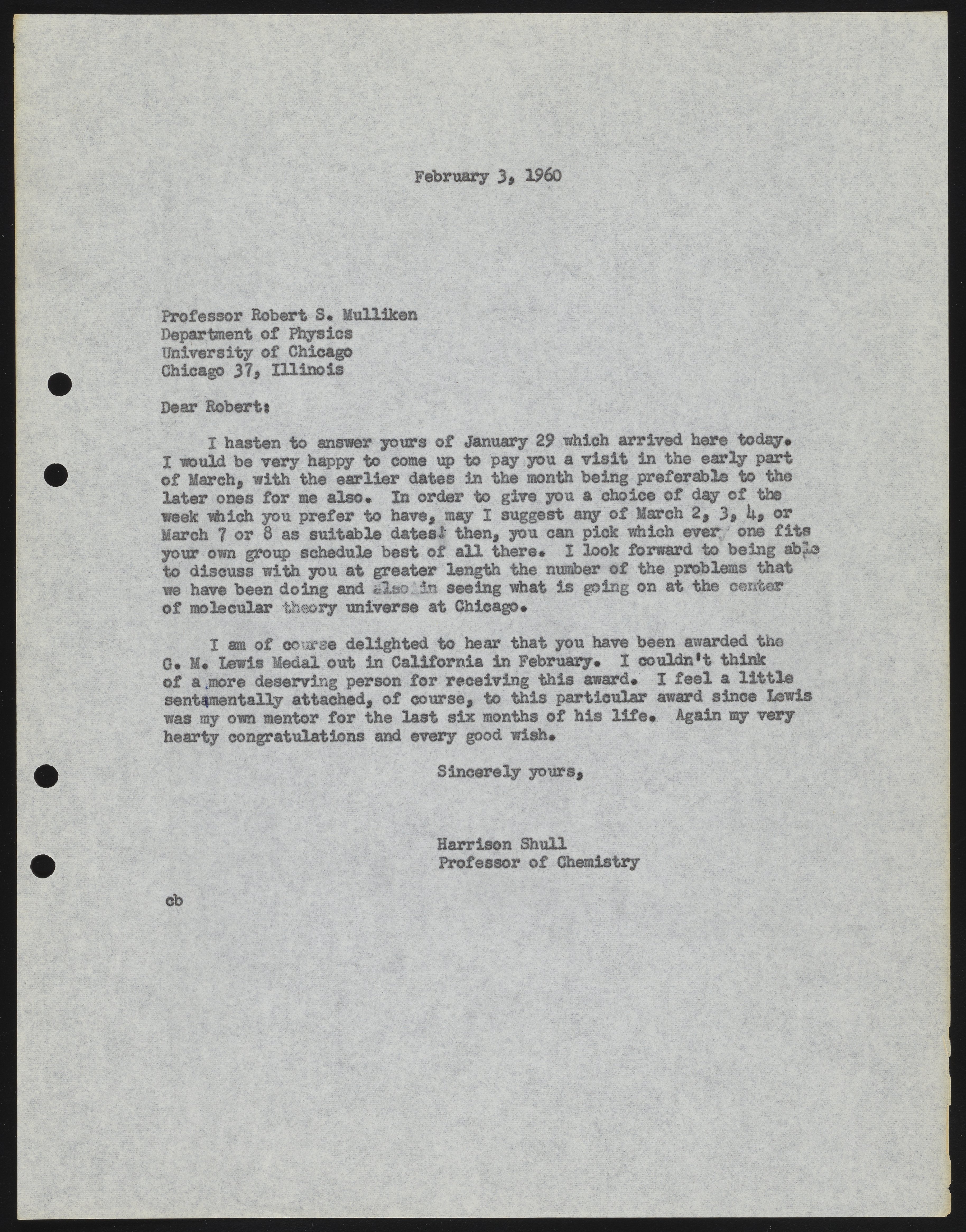 Letter from Harrison Shull to Robert S. Mulliken, 1960
