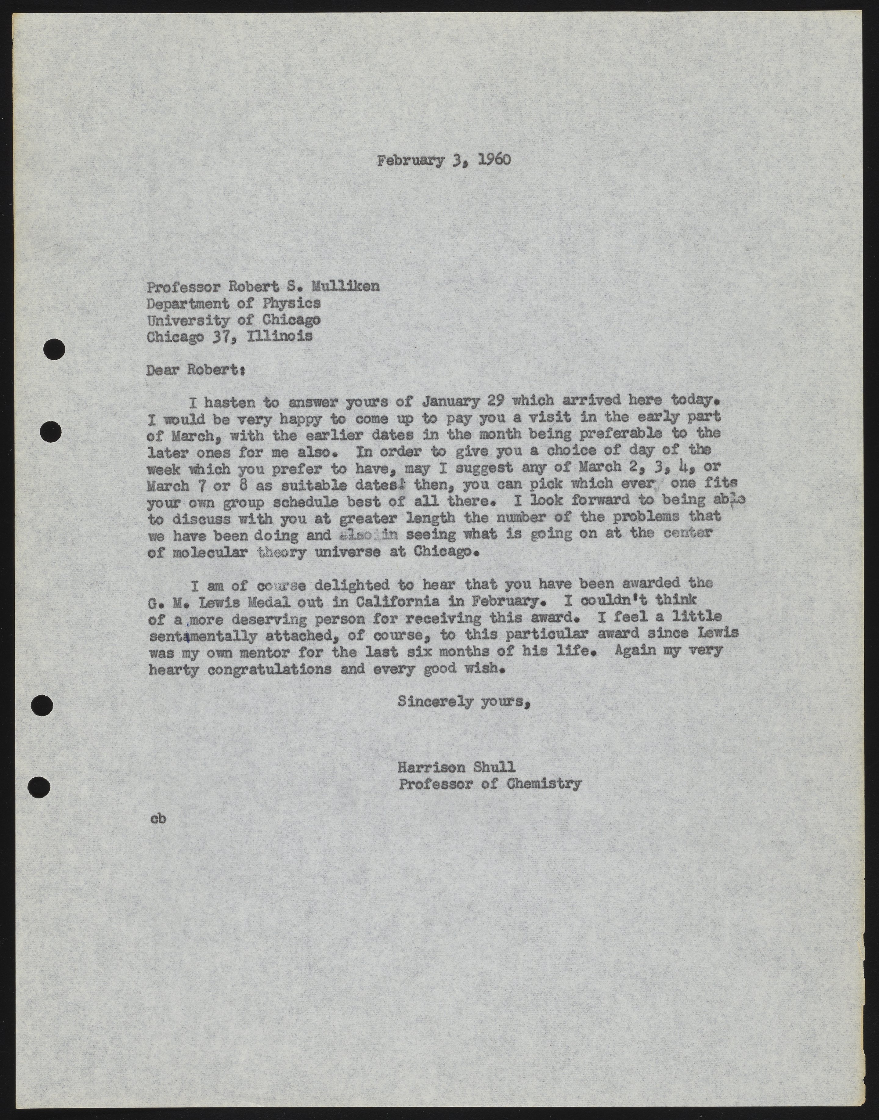 Shull, Harrison. “Letter from Harrison Shull to Robert S. Mulliken, 1960,” February 3, 1960. Robert S. Mulliken & Harrison Shull Correspondence, Box 1. Science History Institute. Philadelphia. https://digital.sciencehistory.org/works/w37636860.