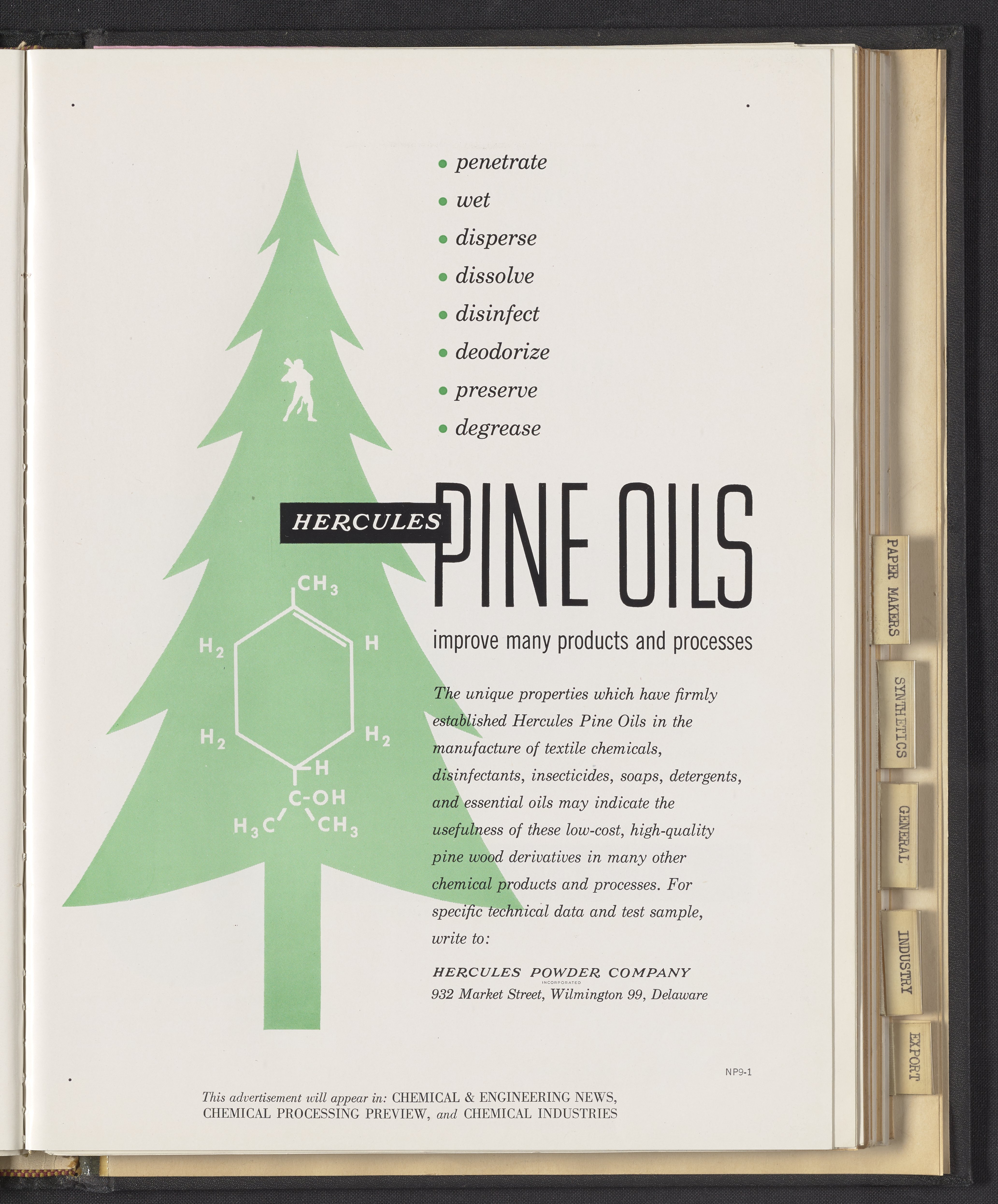 Hercules Incorporated. “Hercules Pine Oils Improve Many Products and Processes.” 1949 Hercules Advertisements, 1949. Records of Hercules Incorporated, Volume 1949. Science History Institute. Philadelphia. https://digital.sciencehistory.org/works/w37637492.
