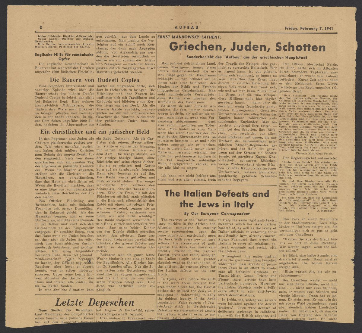 “Aufbau, Volume 7, Number 6.” Aufbau (New York, N.Y.), February 7, 1941. Papers of Georg and Max Bredig, Box 4, Folder 13. Science History Institute. Philadelphia. https://digital.sciencehistory.org/works/w4ult92.