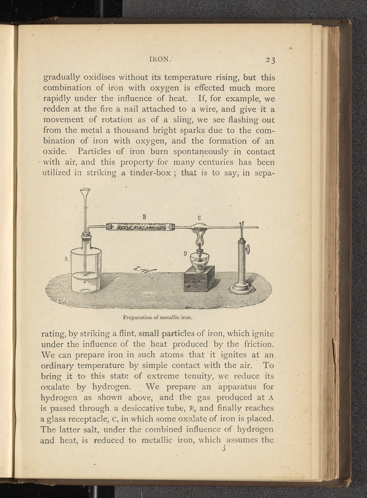 Illustration showing an apparatus used to generate an environment in which iron is able to ignite with oxygen at room temperature. The illustration is labeled to indicate a source of hydrogenated gas, a desiccative tube, and a glass receptacle in which iron oxalate is placed. Inside the apparatus, the iron will be preserved indefinitely, but will ignite immediately upon exposure to the atmosphere. The illustration accompanies text describing common metals.