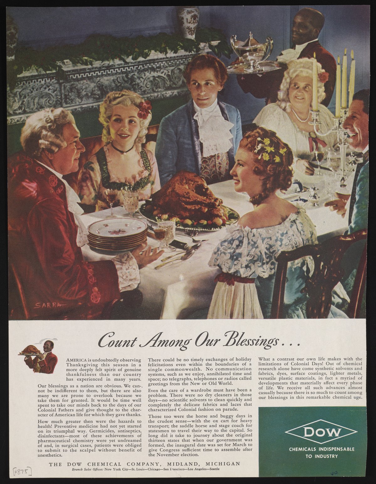 Color print advertisement for Dow Chemical Company. The advertisement features an anachronistic scene of what is described as a "Colonial" celebration of the Thanksgiving holiday, although Thanksgiving was only celebrated intermittently prior to 1863. A group of elaborately-dressed white people sit at a table, while a racially-stereotyped depiction of a Black man in a livery uniform holds a serving dish behind them. The man is also depicted in a smaller illustration holding a turkey. The accompanying text speaks reverently of that era, while simultaneously drawing a contrast between the "limitations of Colonial Days" and recent developments in health, transportation, and even dry cleaning.
