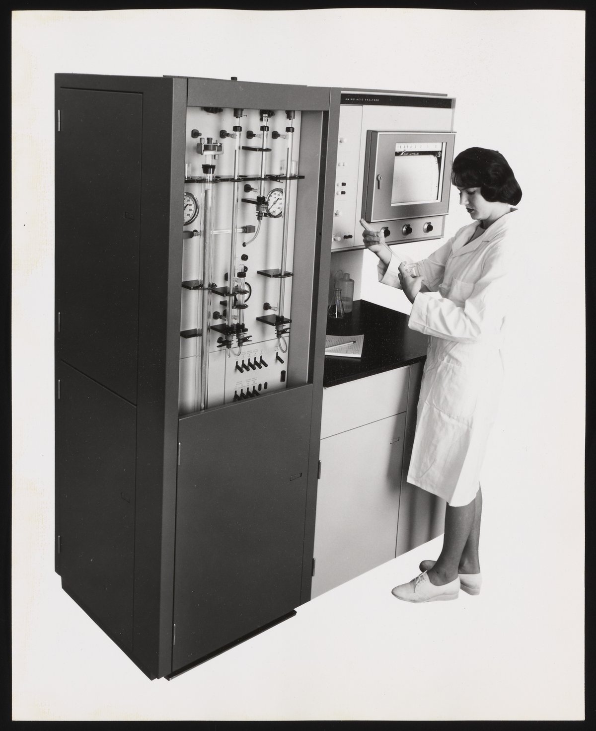 “Unidentified Woman Using a Beckman Amino Acid Analyzer,” n.d. Beckman Historical Collection, Box 78. Science History Institute. Philadelphia. https://digital.sciencehistory.org/works/w6634371m.