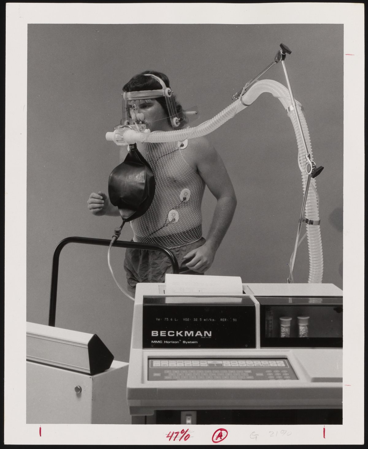 Man with breathing apparatus and electrodes of Beckman MMC Horizon System