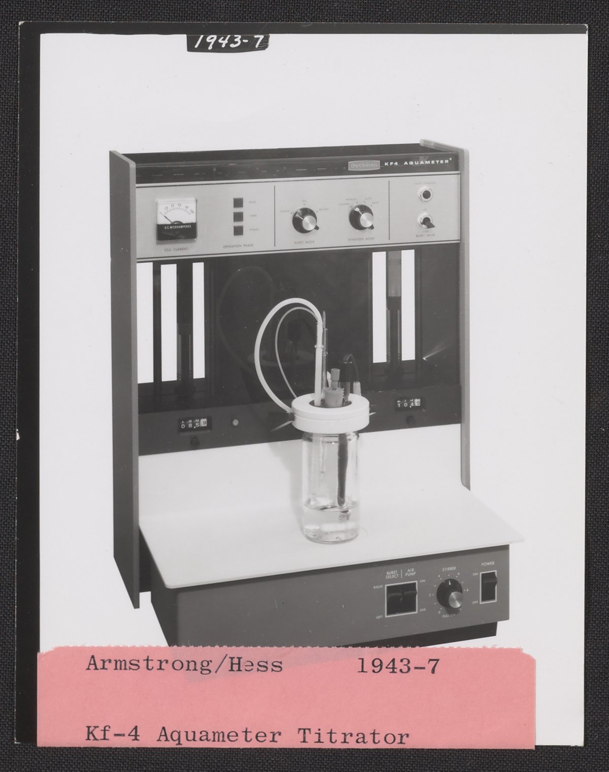 Armstrong & Hess. “Beckman Model KF-4 Aquameter Titrator,” n.d. Beckman Historical Collection, Box 86. Science History Institute. Philadelphia. https://digital.sciencehistory.org/works/w66344103.