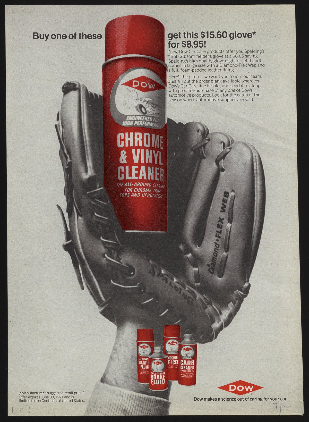 Print advertisement for car care products, including chrome & vinyl cleaner, brake fluid, and windshield de-icer manufactured and sold by the Dow Chemical Company. The advertisement depicts a baseball mitt holding a canister of Dow Chrome & Vinyl Cleaner, with accompanying text detailing a special discount on a Spalding's "Bob Gibson" fielder's glove with purchase.