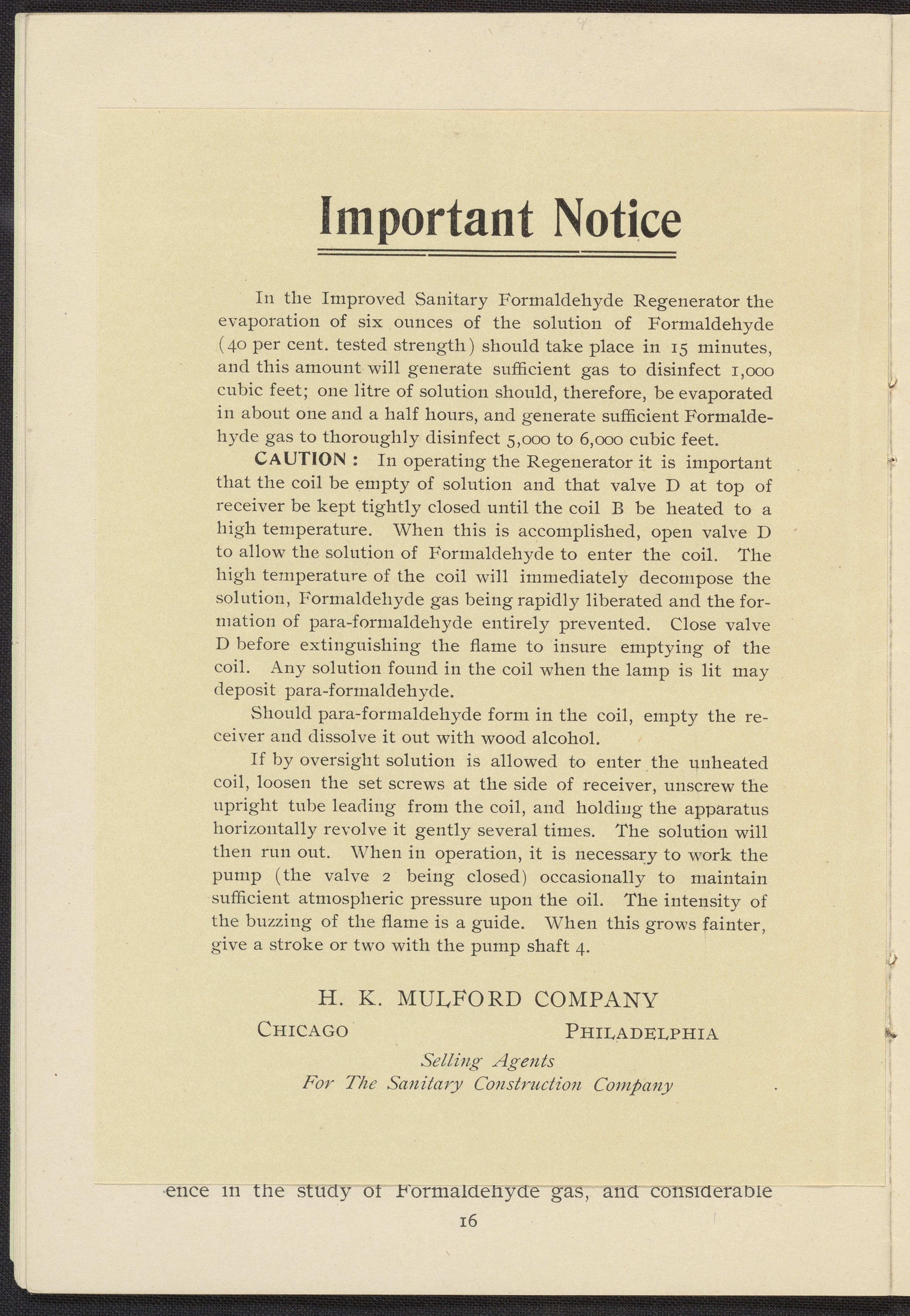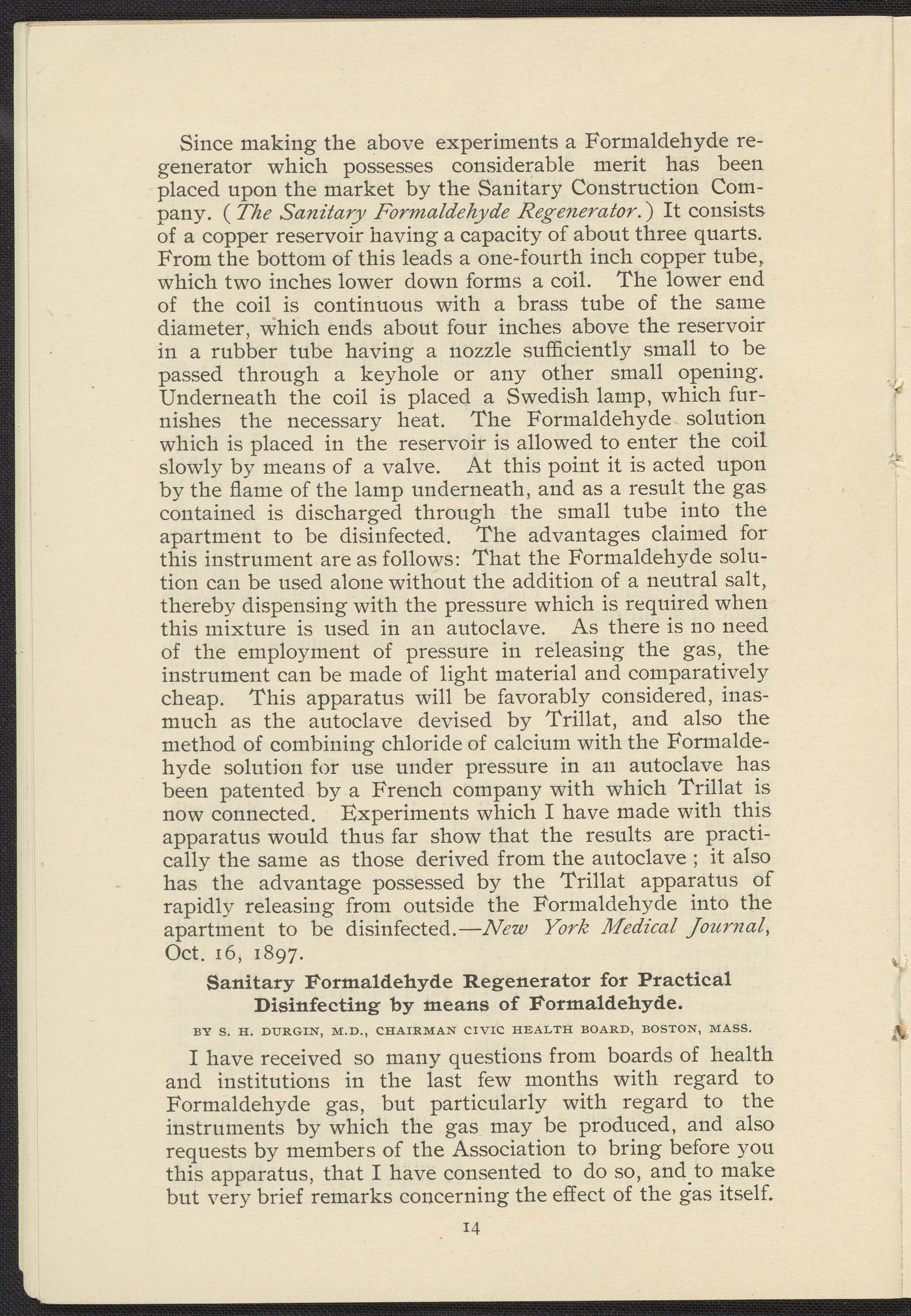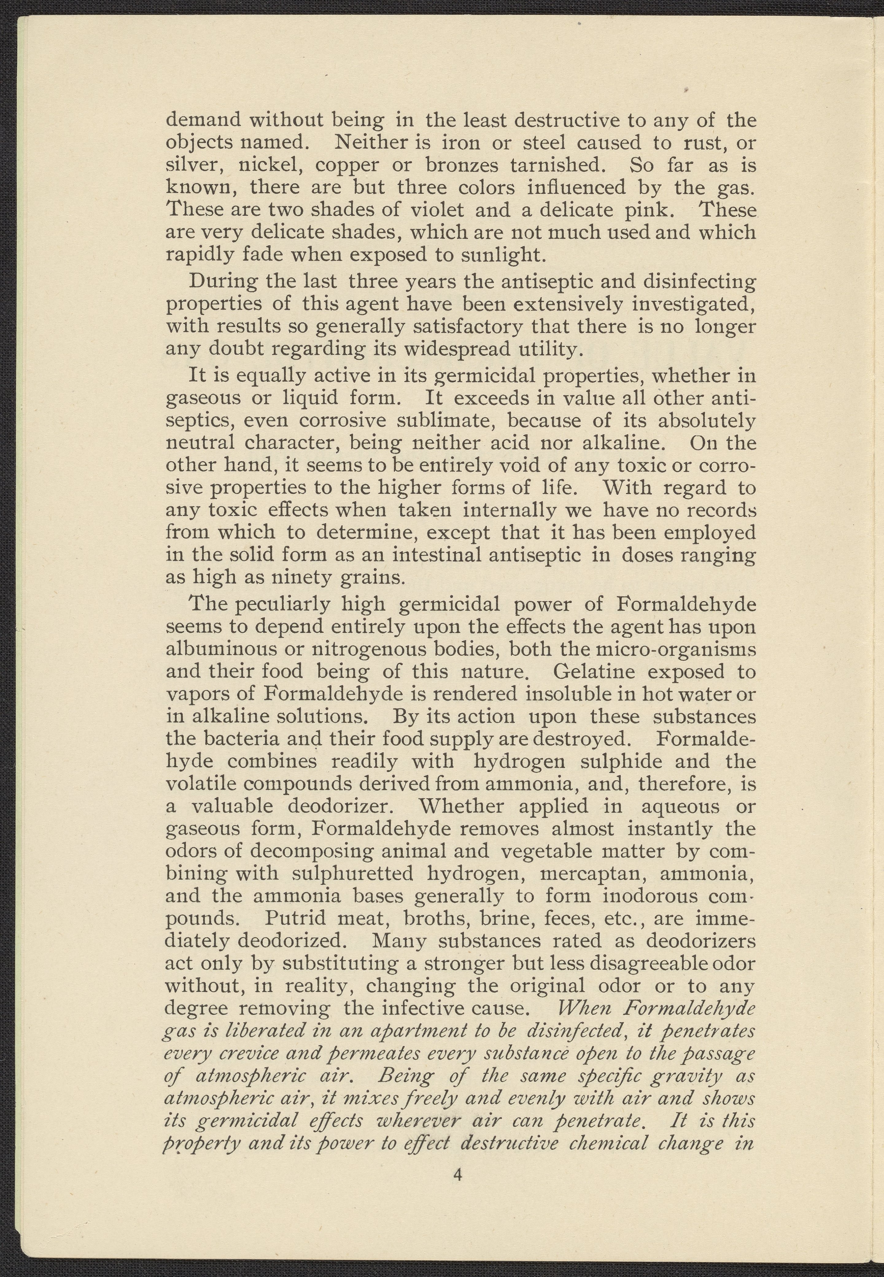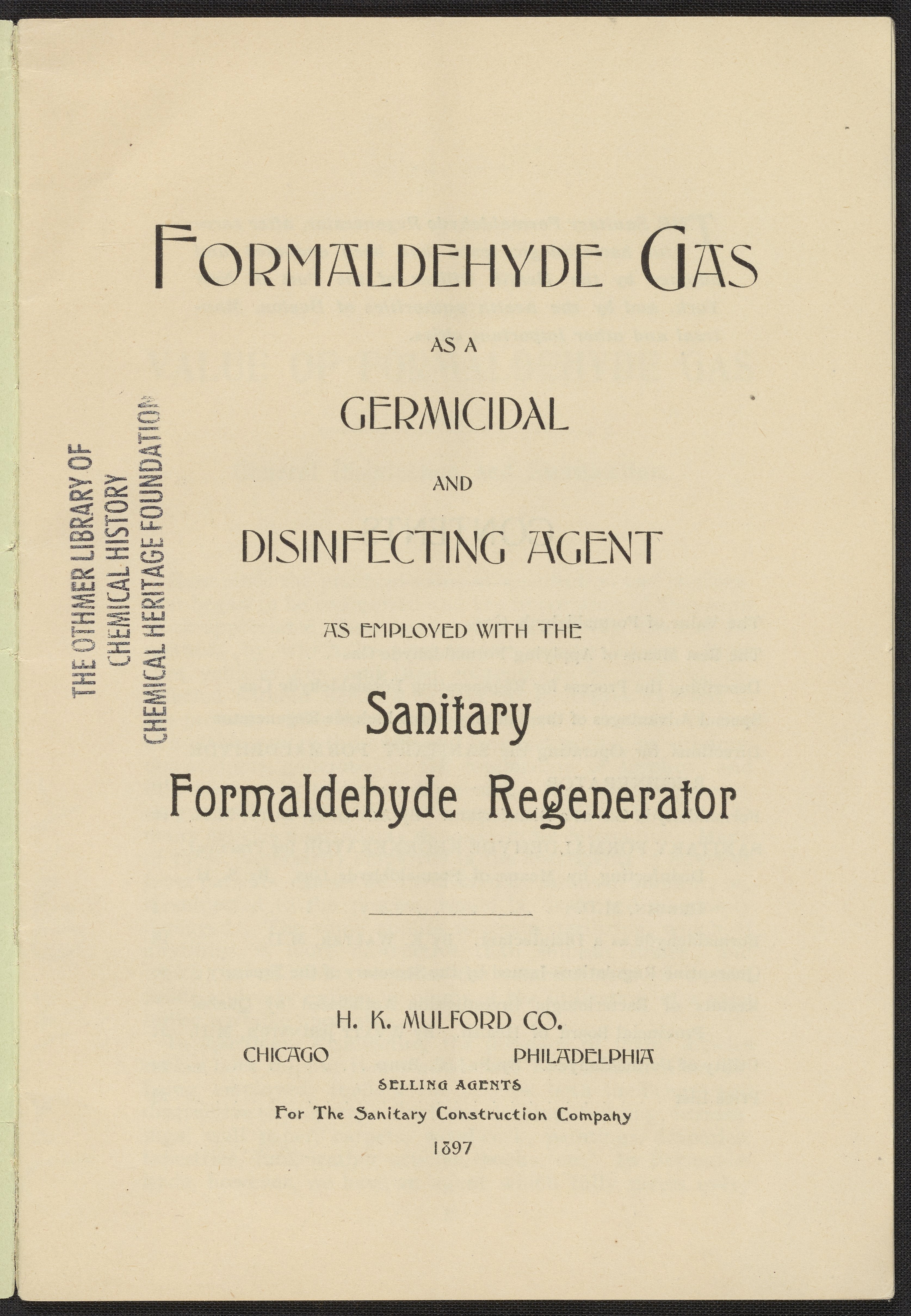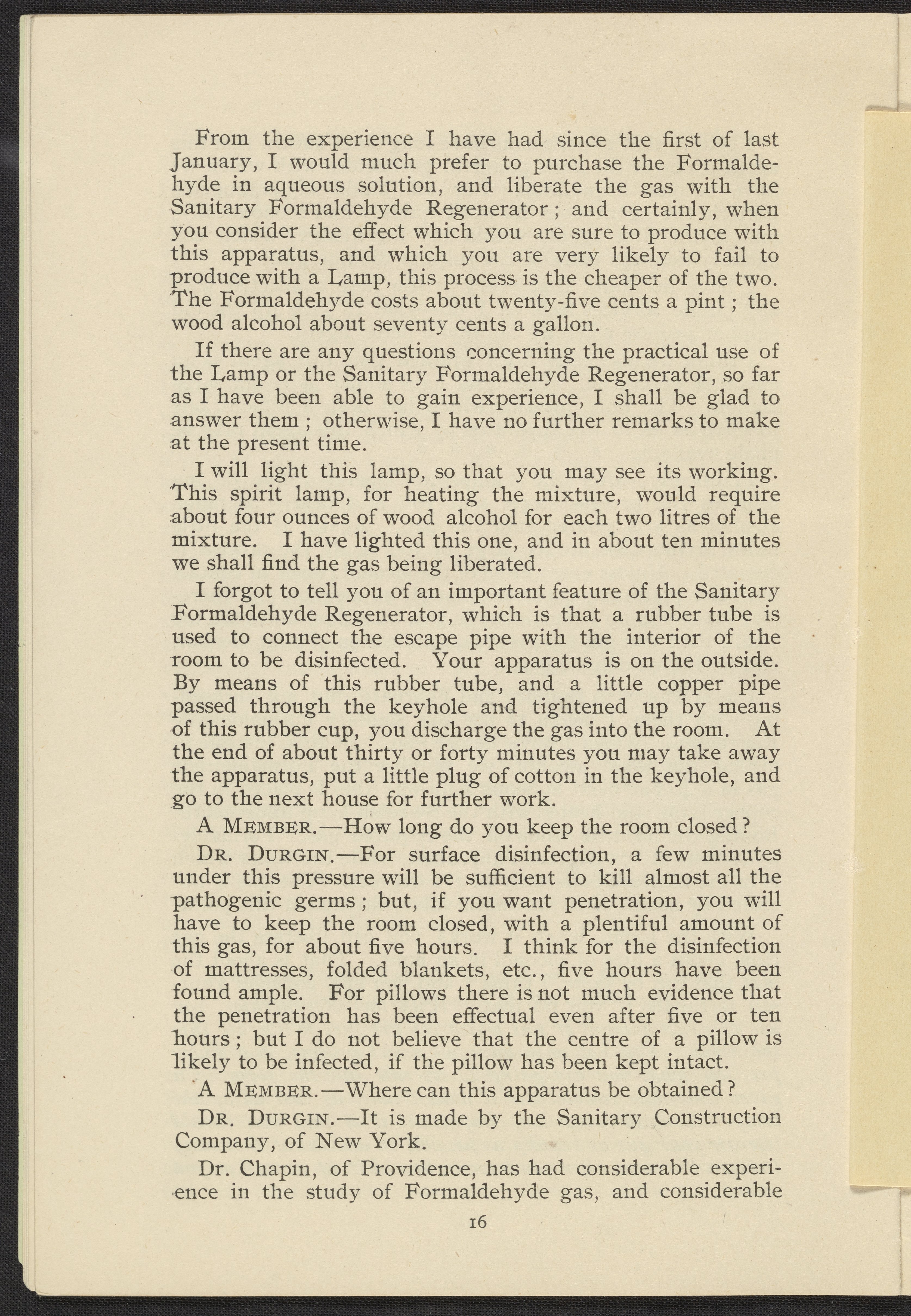 Formaldehyde Gas as a Germicidal and Disinfecting Agent as Employed with the Sanitary Formaldehyde Regenerator