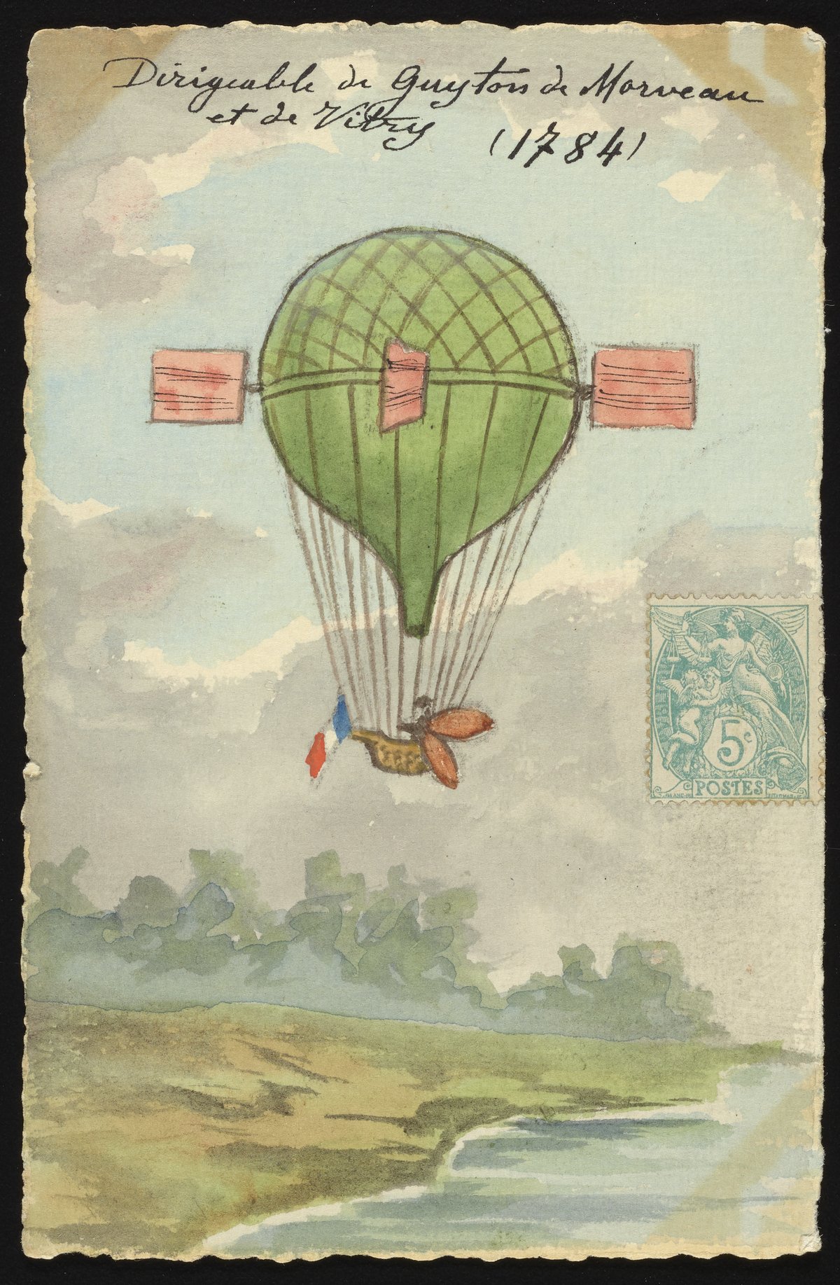 Postcard featuring a hand-drawn illustrated depiction of a flying airship with assorted propulsion mechanisms and a French flag. The illustration depicts a type of airship flown by French chemist and politician Louis-Bernard Guyton de Morveau (1737-1816) in 1784. This postcard is part of a set originally collected in a scrapbook entitled Album Gravures et Cartes-Postales: Vieux Paris Types Petits Métiers et Cris De La Rue (1909).