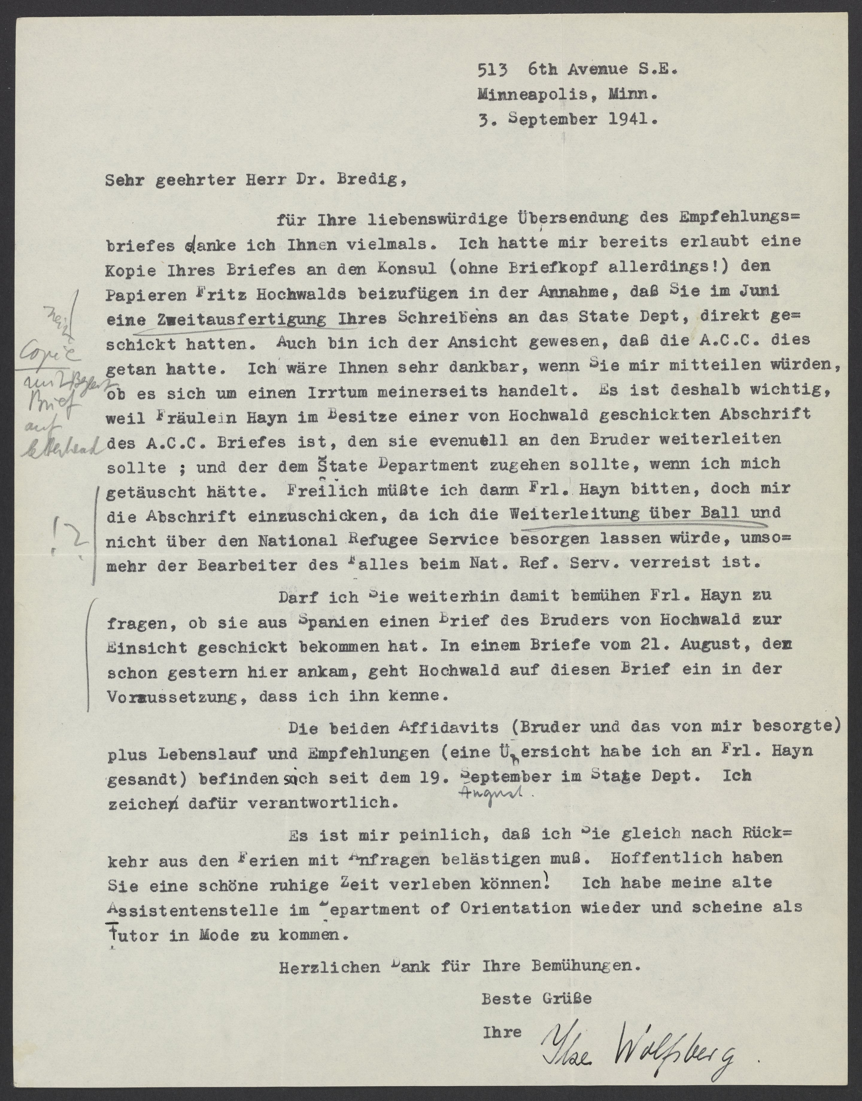Thank you very much for kindly sending the recommendation. I had already taken the liberty of enclosing a copy of your letter to the consul (without the letterhead, of course) with Fritz Hochwald's papers. I did this on the assumption that you had sent a duplicate of your letter directly to the State Dept in June. I also thought the A.C.C. had done this. I would be very grateful if you would tell me whether it was a mistake on my part. It is important because Ms. Hayn has a copy the A.C.C letter sent by Hochwald. She should probably forward it to his brother, and if I am not mistaken, to the State Department. Of course, I would then have to ask Ms. Hayn to send me the copy, since I would have it forwarded via Senator Ball and not the National Refugee Service. The person handling the case at the National Refugee Service is away.