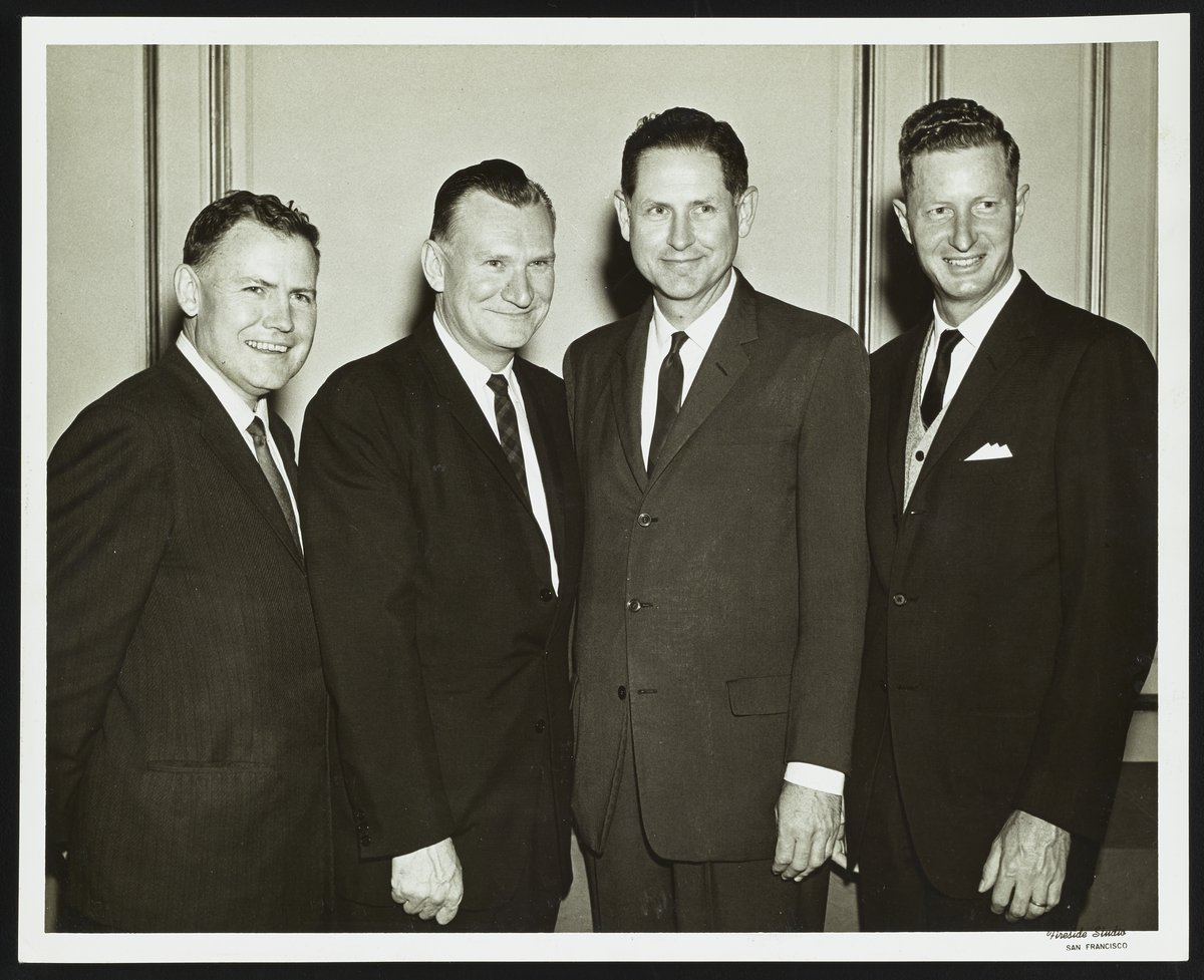 Group photograph of the officers of the American Society for Testing and Materials (ASTM) E-14 on Mass Spectrometry taken at a conference in San Francisco. Present from left are Norman D. Coggeshall (Vice Chair, Program); R.E. Fox (Chairman); Andrew Gans "Jack" Sharkey, Jr. (Vice Chair, Arrangements); and Henry Earle Lumpkin (Secretary and Treasurer).