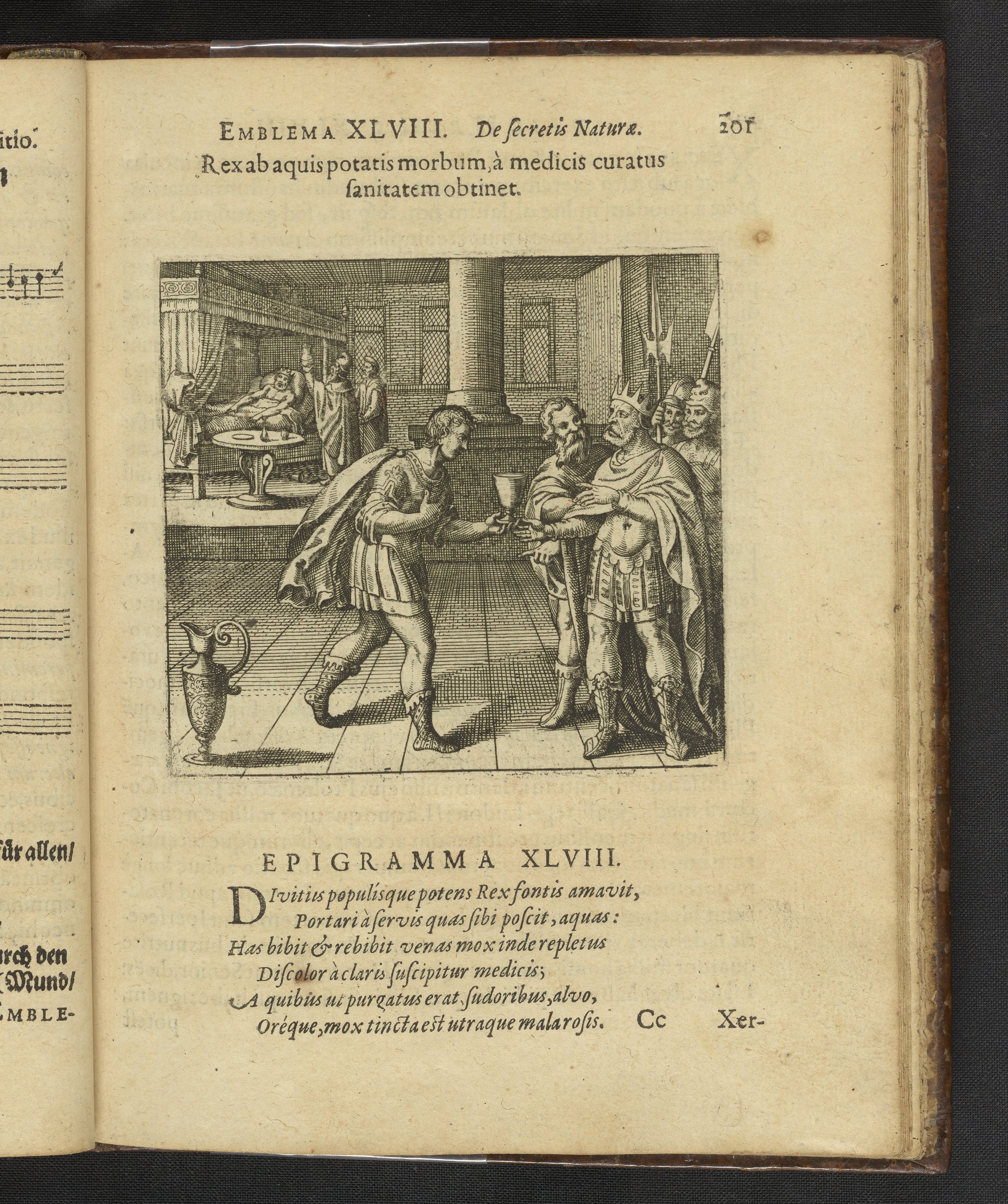 Maier, Michael. “Emblema XLVIII. Rex Ab Aquis Potatis Morbum, à Medicis Curatus Sanitatem Obtinet.” In Atalanta Fugiens. Oppenheim, Germany: Johann-Theodor de Bry, 1618. https://digital.sciencehistory.org/works/w95051292.