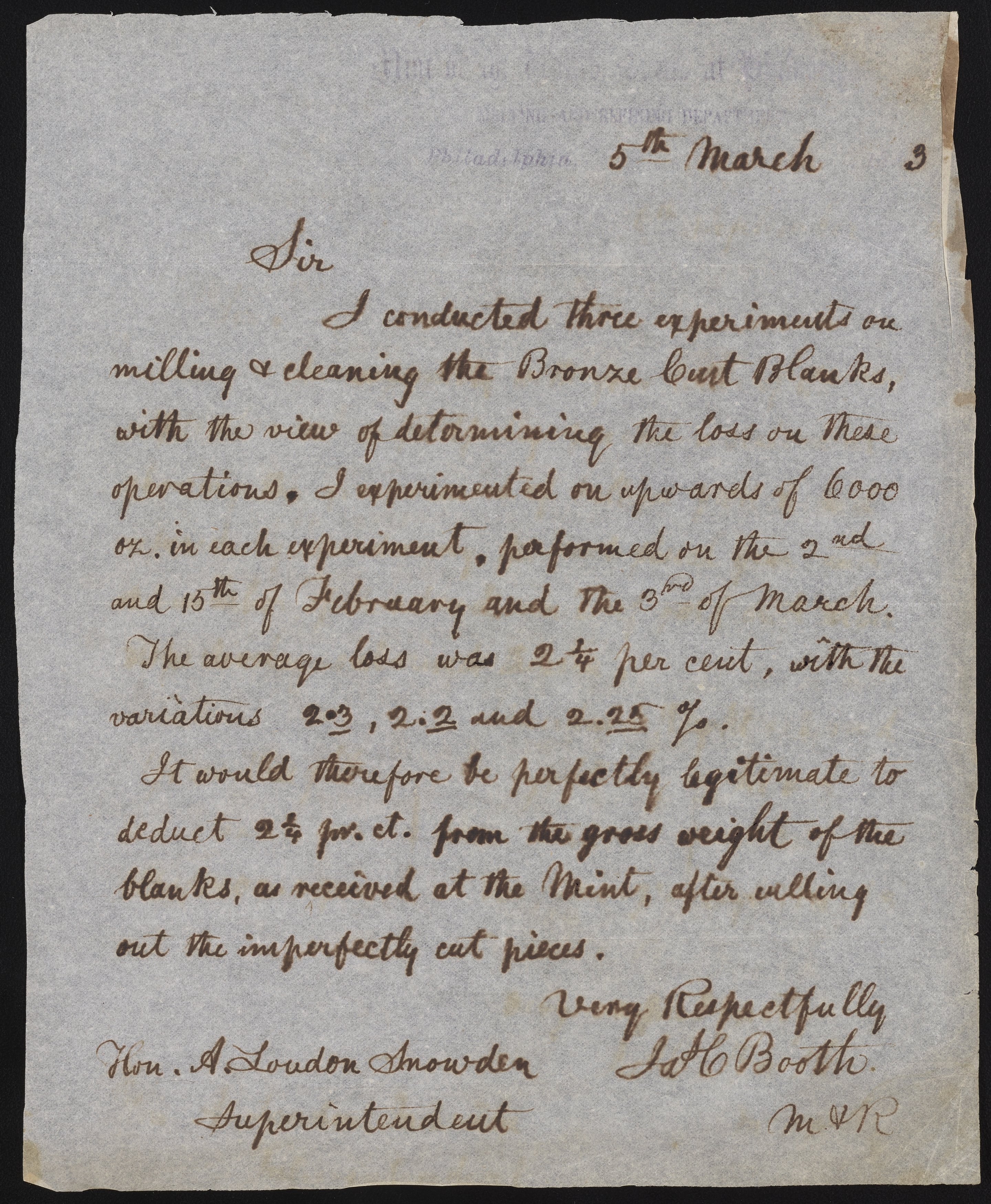 James Curtis Booth (1810-1888) writes to Archibald Loudon Snowden (1835-1912), Superintendent of the United States Mint at Philadelphia from 1879 to 1885, regarding the milling and cleaning of bronze blanks.