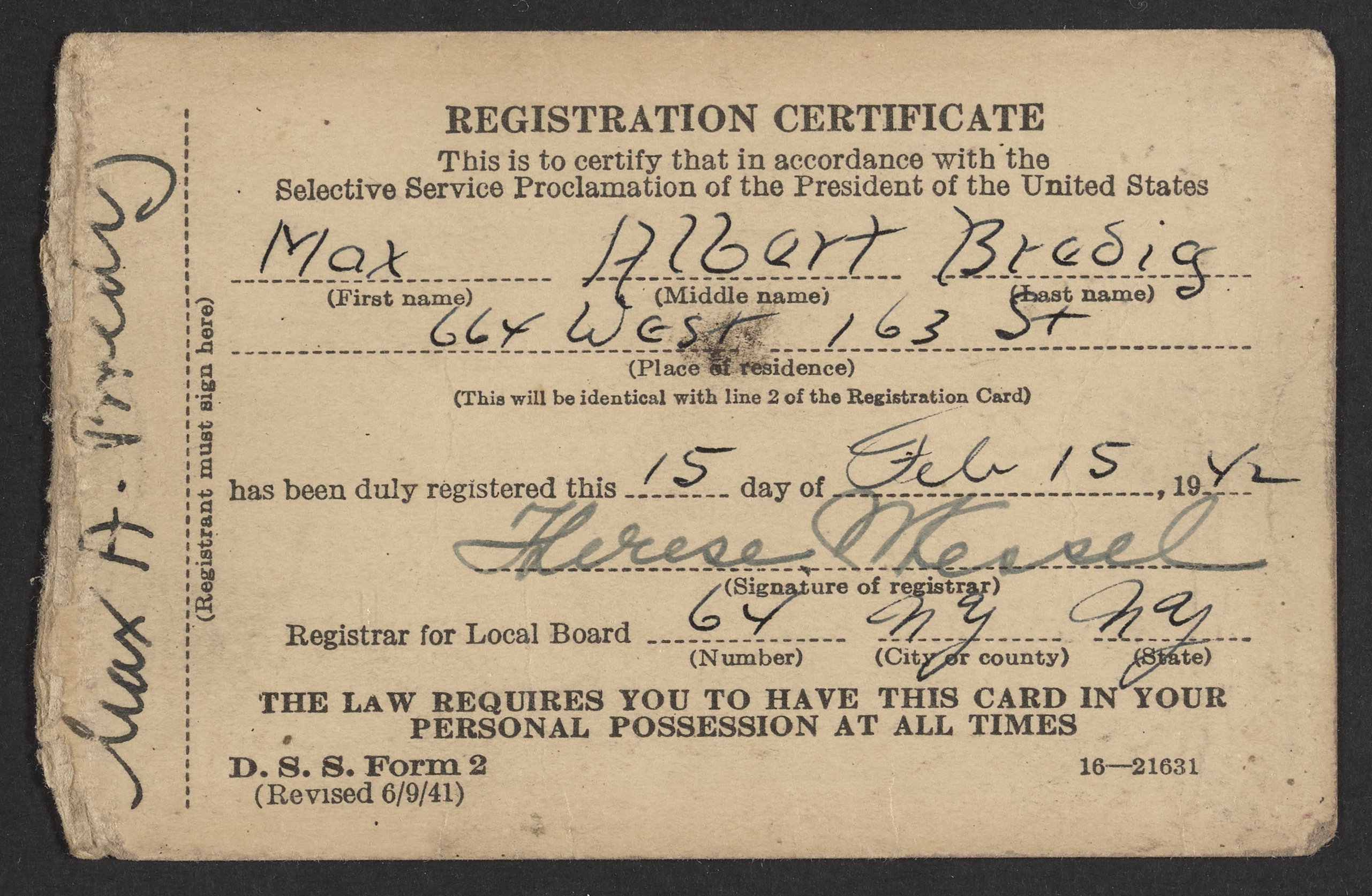 United States. Office of Selective Service Records. “Max Bredig's Selective Service Registration Certificate,” February 15, 1942. Papers of Max Bredig, Box 5, Folder 47. Science History Institute. Philadelphia. https://digital.sciencehistory.org/works/wavzfzx.
