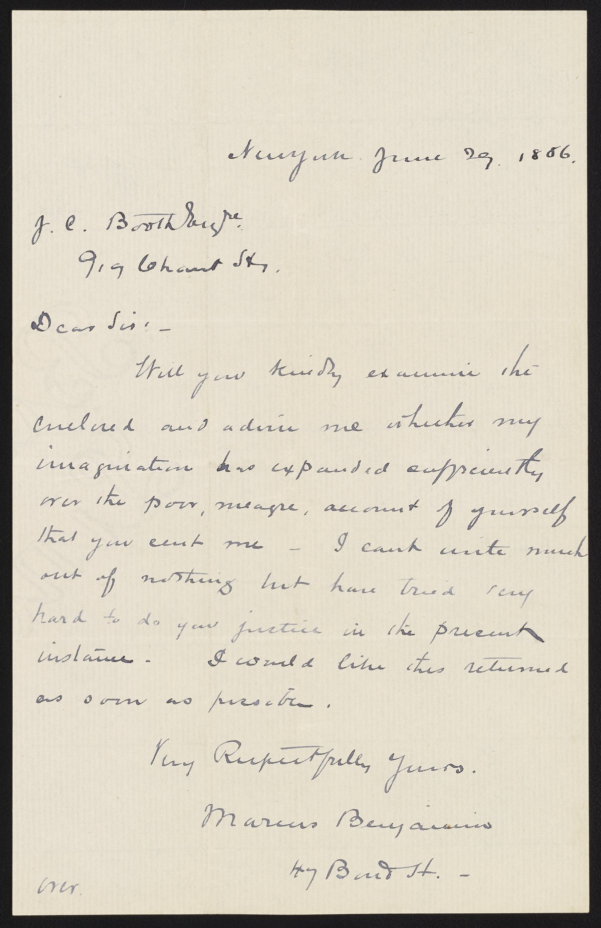 Letter from Marcus Benjamin to James Curtis Booth, June 20, 1886