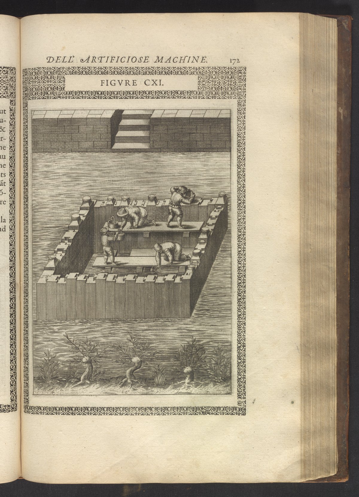 Ramelli, Agostino. “Plate 111: Cofferdam Used to Drain Relatively High Water.” In Le Diverse Et Artificiose Machine Del Capitano Agostino Ramelli. Paris, France, 1588. https://digital.sciencehistory.org/works/wd375w55t.