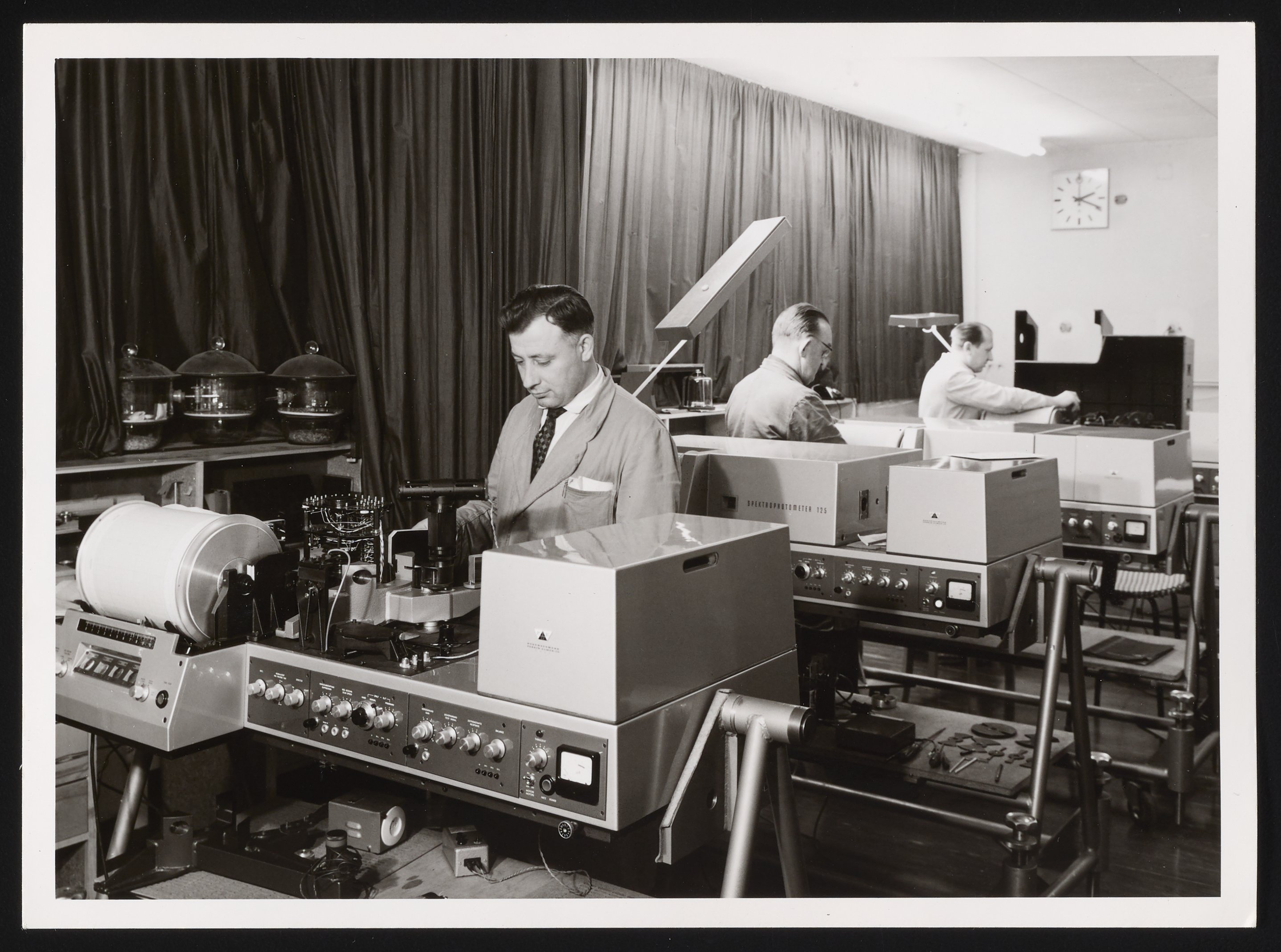 General view of a test shop for the Perkin-Elmer Model 125 Spectrophotometer. The individuals present in the photograph are unidentified. Per contextual information accompanying the photograph, the test shop may have been associated with the Bodensee Perkin-Elmer Museum of Instrumental Analysis established in Bodensee, Germany by Perkin-Elmer's European branch.