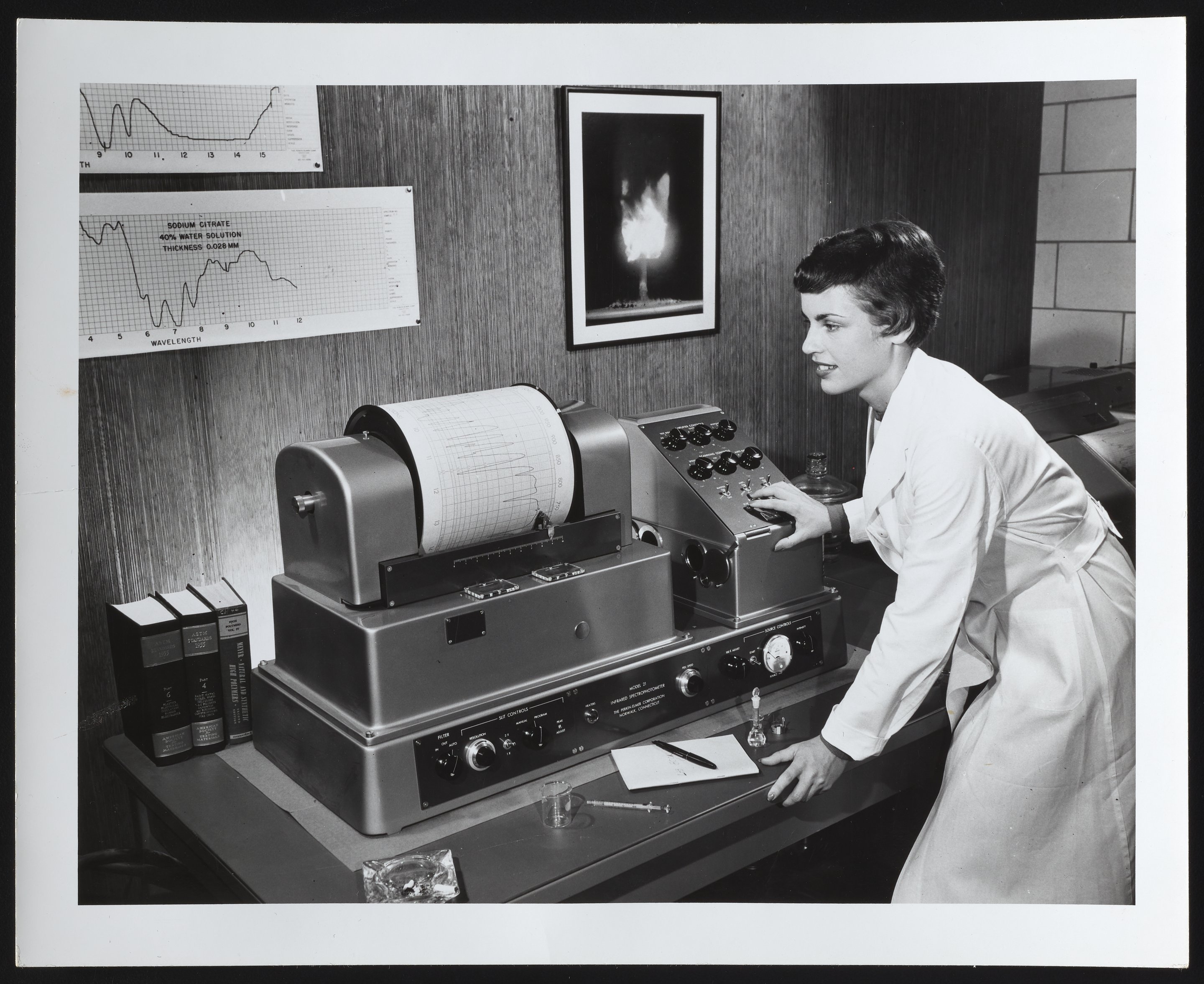 Perkin-Elmer Corporation. “Perkin-Elmer Model 21 Infrared Spectrophotometer,” 1950–1959. Photographs from the Perkin-Elmer-Applera Collection, Box 3. Science History Institute. Philadelphia. https://digital.sciencehistory.org/works/wd375x11z.